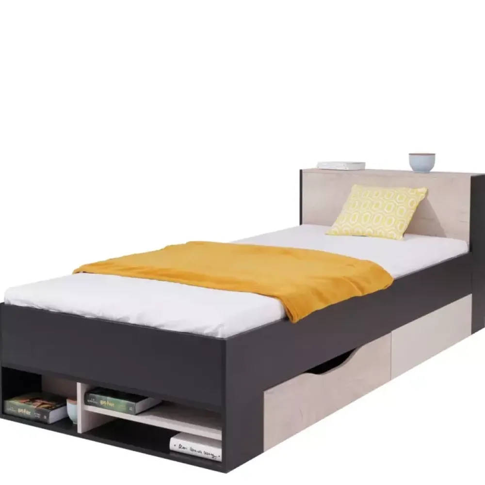 Komplet nowoczesnych mebli do pokoju młodzieżowego z kolekcji mebli systemowych PRESSCOT w skład którego wchodzi łóżko z wysuwanym panelem z półkami, dodatkowo zostało wyposażone w pojemnik na pościel w formie szuflady, dzięki czemu zyskasz szybki dostęp do najpotrzebniejszych akcesoriów sypialnianych. Jeżeli szukasz miejsca na ubrania, to szafa narożna jest bardzo pojemnym rozwiązaniem, dzięki swojej bryle, posiadająca wiele pólek i aż dwa drążki na wieszaki będzie świetnym wyborem. Regał, został wyposażony w półki otwarte oraz parę drzwi, gdzie za drzwiami znajdują się półki. Biurko które jest w zestawie, posiada dwie szuflady i szafkę, a pod blatem wnękę, dzięki czemu zyskasz szybki dostęp do najpotrzebniejszych akcesoriów, zostało dodatkowo wyposażone w nadstawkę. Regał zamknięty również jest miejscem, gdzie możesz umiejscowić swoje ubrania, a półka na książki, jest idealnym uzupełnieniem kolekcji, gdzie umieścisz swoje akcesoria i dekory.