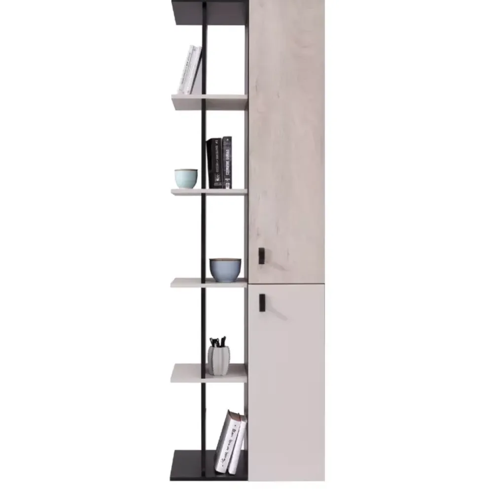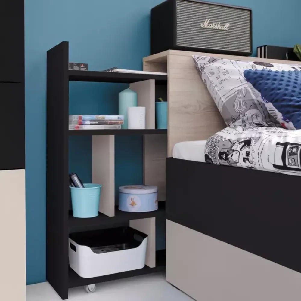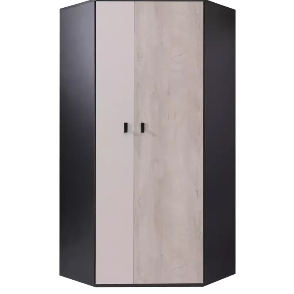 - Komplet mebli do pokoju młodzieżowego z kolekcji PRESSCOT w skład którego wchodzi łóżko z wysuwanym panelem z półkami, szafa narożna posiadająca wiele miejsca na wieszaki, regał z półkami otwartymi, biurko z nadstawką, półka i regał zamknięty.