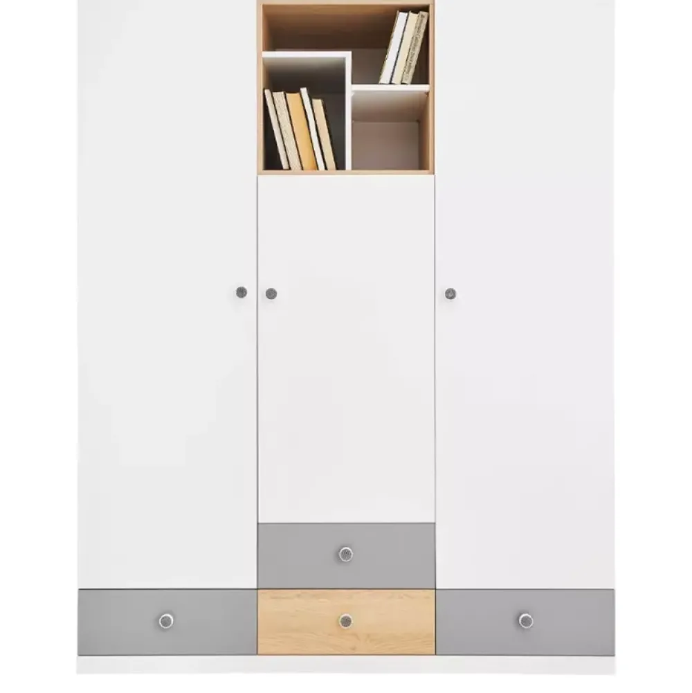 - Meble młodzieżowe z kolekcji PATHE. Korpusy w kolorze dębu biszkoptowego. Fronty w kolorach bieli, szarości oraz dębu biszkoptowego. W skład zestawu wchodzi szafa trzydrzwiowa, biurko, mała komoda, szafka RTV, półka wisząca oraz łóżko.