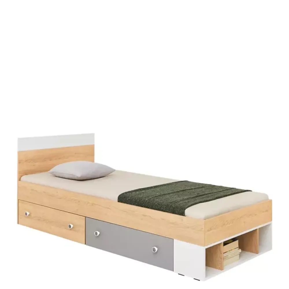 Zestaw mebli PATHE z kolekcji mebli do pokoju młodzieżowego. Postawiono w nim na jedną dużą szafę, trzydrzwiową, która będzie pełnić funkcję przechowalni ubrań, pozostałe elementy są zdecydowanie bardziej kompaktowe, komoda, szafka rtv, biurko czy półka wisząca z łatwością znajdą swoje miejsce, więc bez trudu dostosujecie ten zestaw do pokoju waszego dziecka. Łóżko o powierzchni spania 90×200 cm będzie świetną strefą odpoczynku i relaksu, co więcej łóżko posiada dwie pojemne szuflady, które mogą pełnić funkcję pojemników na pościel. W zestawie nie ma materaca do łóżka, rekomendowane modele prezentujemy poniżej opisu.