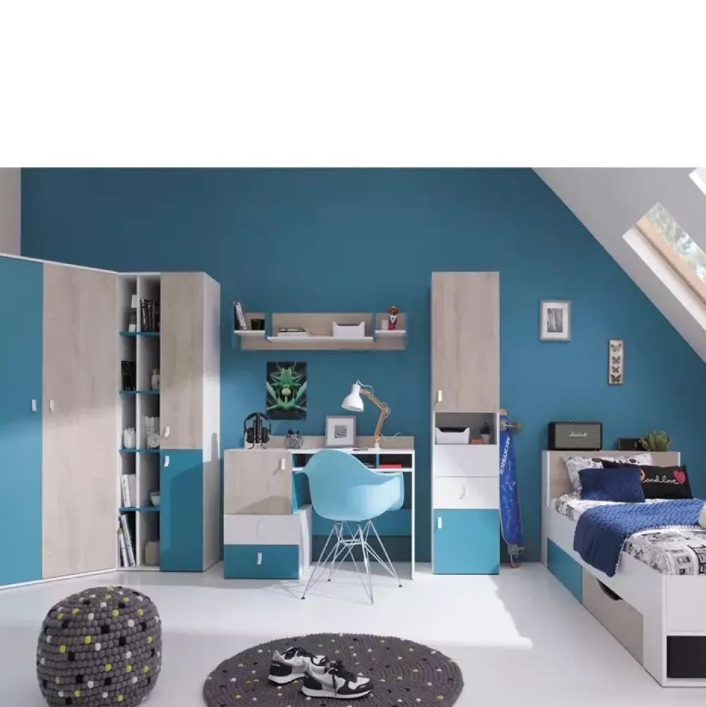 Meble to pokoju młodzieżowego z kolekcji mebli systemowych PRESSCOT to zestaw, który zawiera najpotrzebniejsze meble do wyposażenia pokoju młodzieżowego. Szafa narożna, która znalazła miejsce w zestawie, została wyposażona w pięć półek i dwa drążki na wieszaki, dzięki czemu stanowi bardzo pojemną propozycję, dzięki której zmieścisz swoje ubrania. Regał wyposażony w otwarte półki jest miejscem, gdzie schowasz swoje akcesoria oraz zagospodarujesz otwarte półki dekorami, które ożywią twoje pomieszczenie. Biurko posiada dwie pojemne szuflady na niezbędne akcesoria oraz szafkę i wnękę pod blatem. Regał zamknięty jest idealną propozycją, aby zyskać miejsca na dodatkowe ubrania. Łóżko wyposażono w praktyczny pojemnik na pościel w formie szuflady i panel wysuwany z półkami. Uzupełnieniem zestawu pozostała półka wisząca na książki wykonana w nowoczesnej stylistyce, dzięki czemu przyciąga uwagę.