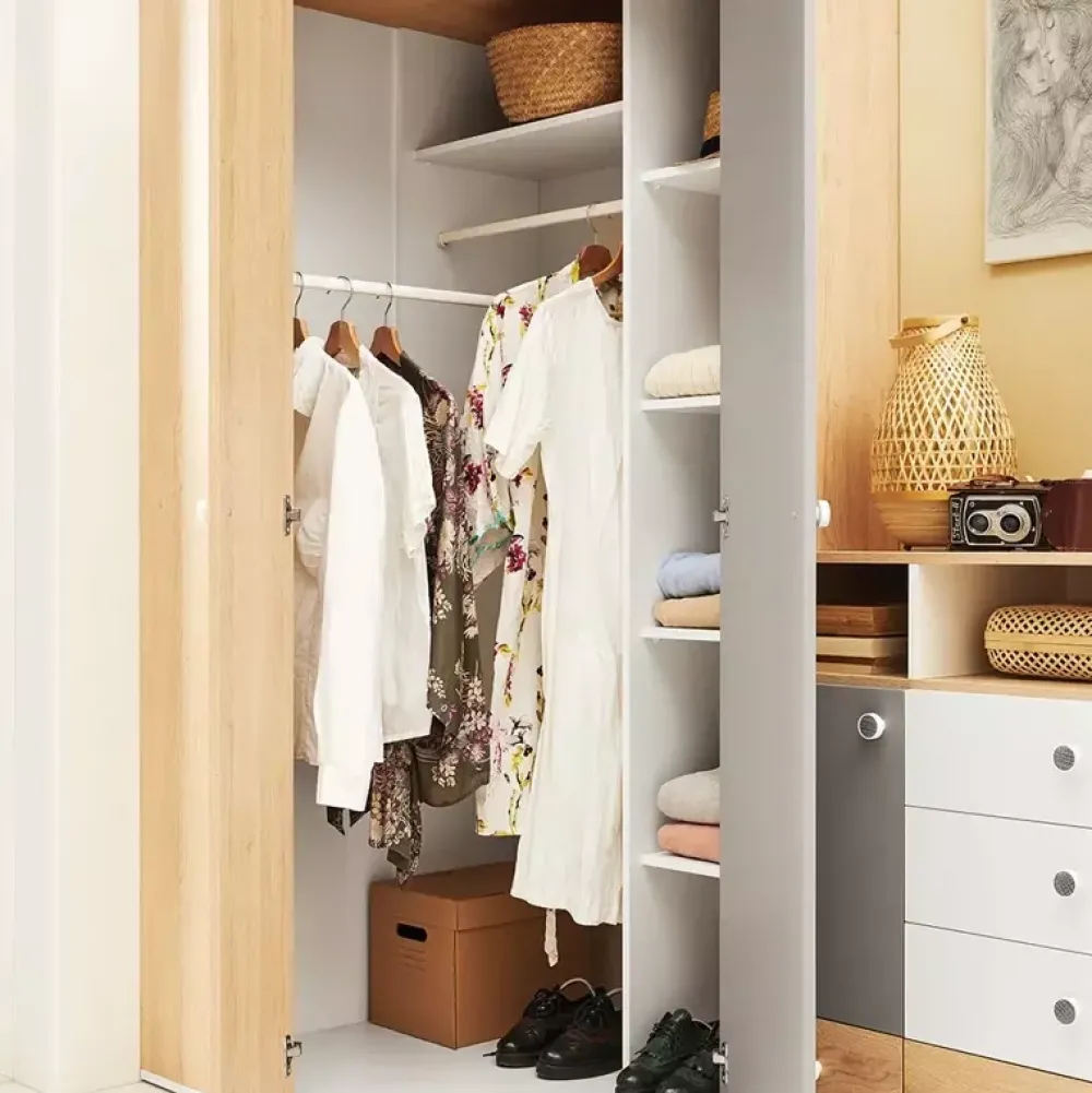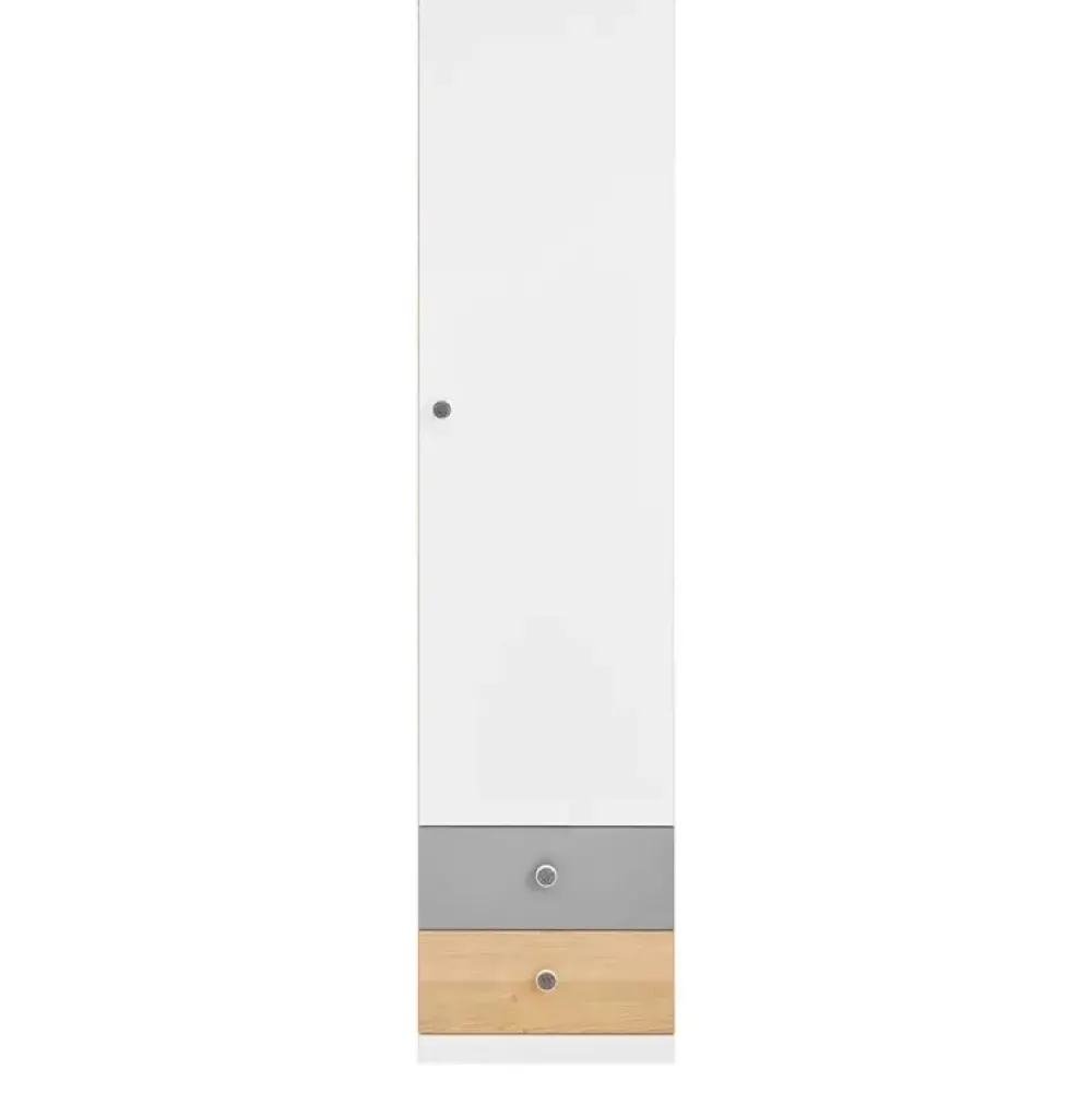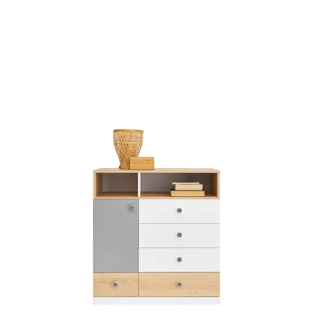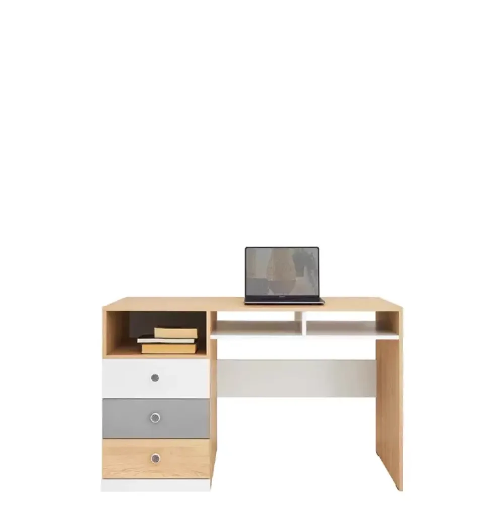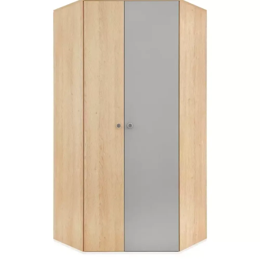 - Zestaw mebli młodzieżowych z kolekcji PATHE. Korpusy w kolorze dębu biszkoptowego. Fronty w kolorach bieli, szarości oraz dębu biszkoptowego. Komplet zawiera szafę narożną, dwa regały, biurko, komodę z szufladami, półkę wisząca oraz łóżko.