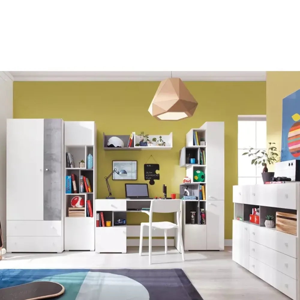 - Komplet mebli do pokoju młodzieżowego z dwudrzwiową szafą z szufladami, dwoma wysokimi regałami, biurkiem, szeroką pojemną komodą i półką wiszącą.
