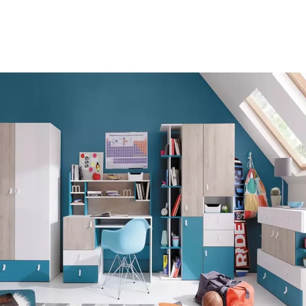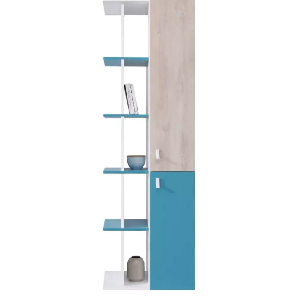- Wysoki regał z kolekcji młodzieżowych mebli systemowych PRESSCOT który idealnie sprawdza się w pokojach młodzieżowych. Regał został wyposażony we wiele otwartych półek, na których możesz umiejscowić swoje akcesoria, za drzwiami znajdują się trzy półki.