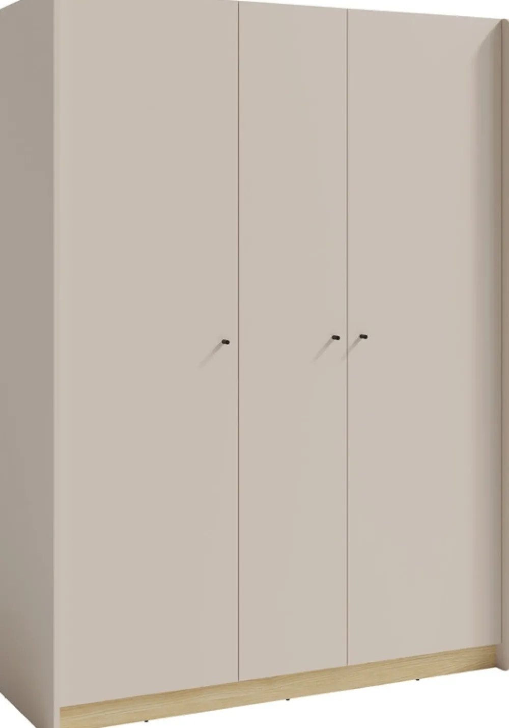 Trzydrzwiowa szafa z półkami i drążkiem na wieszaki to sposób na doskonałą organizację. Ubrania, buty i akcesoria znajdą swoje miejsce, a dzięki przestronności szafy utrzymanie porządku stanie się prostsze niż kiedykolwiek. Obrzeża ABS dodają meblom wytrzymałości, co sprawia, że ALDENO to inwestycja na lata.