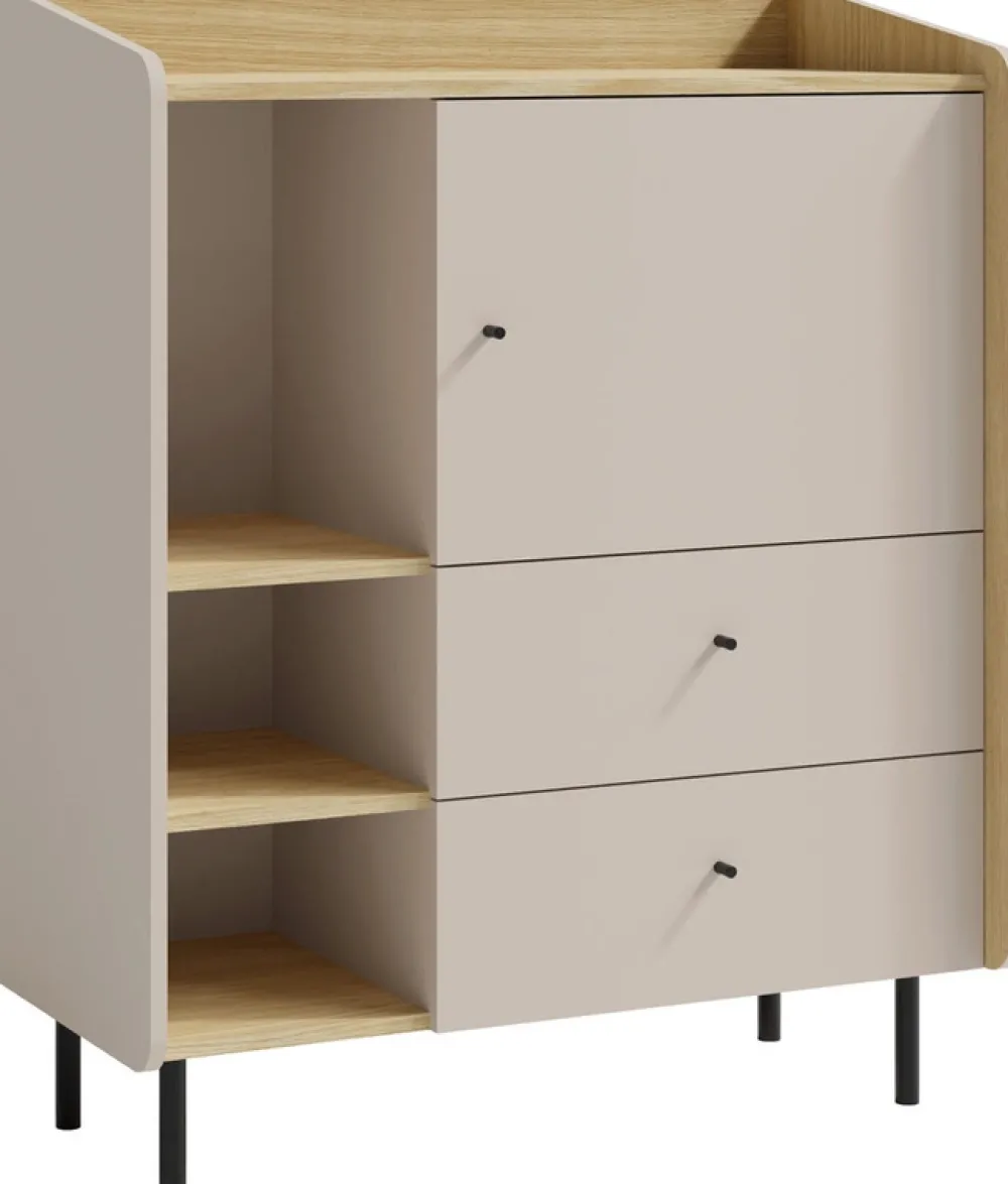 Dopełnieniem kompletu jest praktyczna komoda z półkami i dwiema szufladami. To idealne miejsce na przechowywanie zarówno codziennych drobiazgów, jak i tych ważniejszych skarbów, które zasługują na swoje specjalne miejsce.