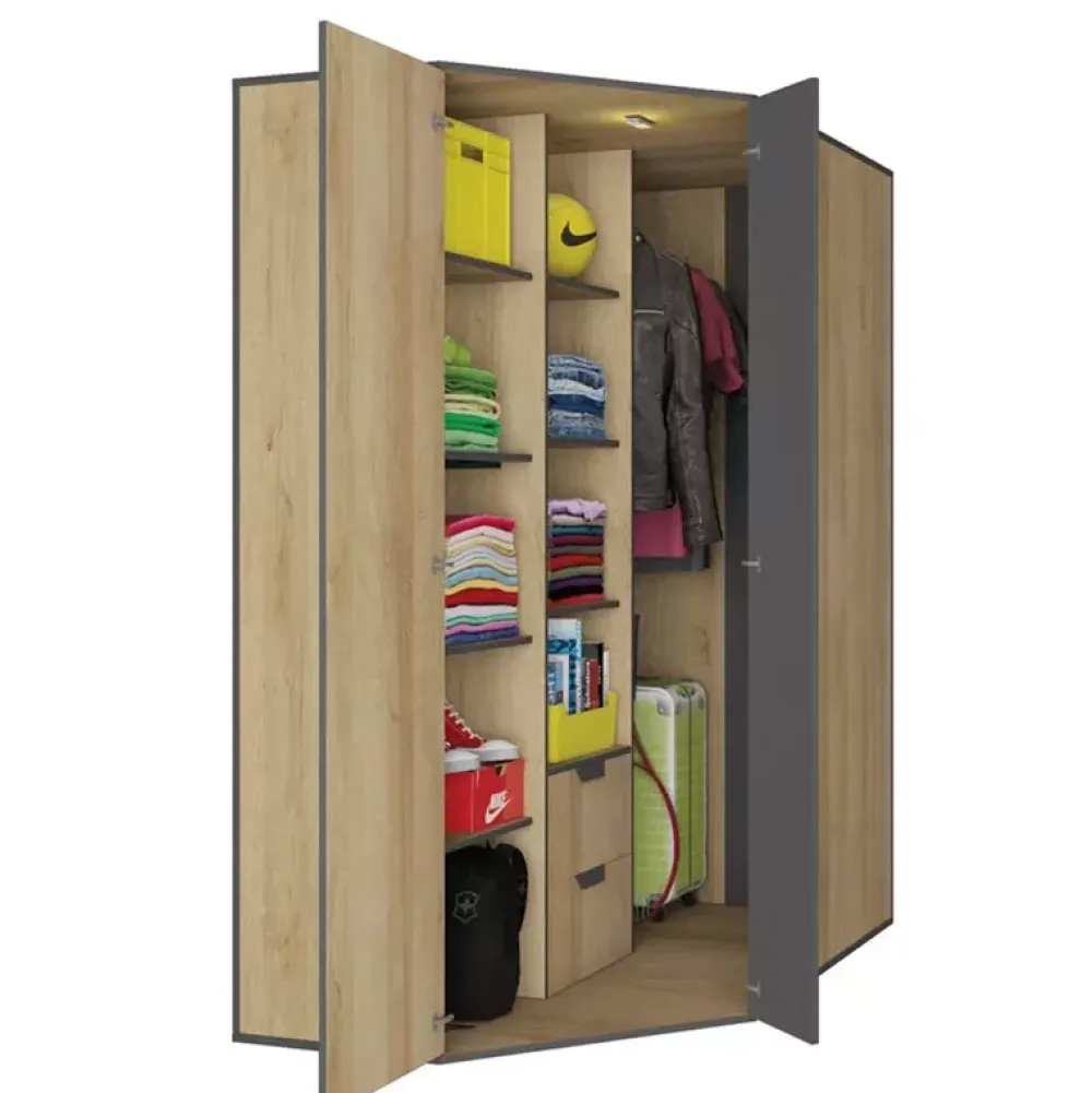 - Zestaw mebli do pokoju młodzieżowego NELSE składający się z bardzo pojemnej szafy narożnej, łóżka z pojemnikiem na tekstylia, komody z szufladami, dwóch regałów na książki, biurka z szafką i szufladą oraz półki wiszącej.