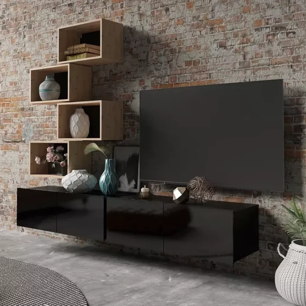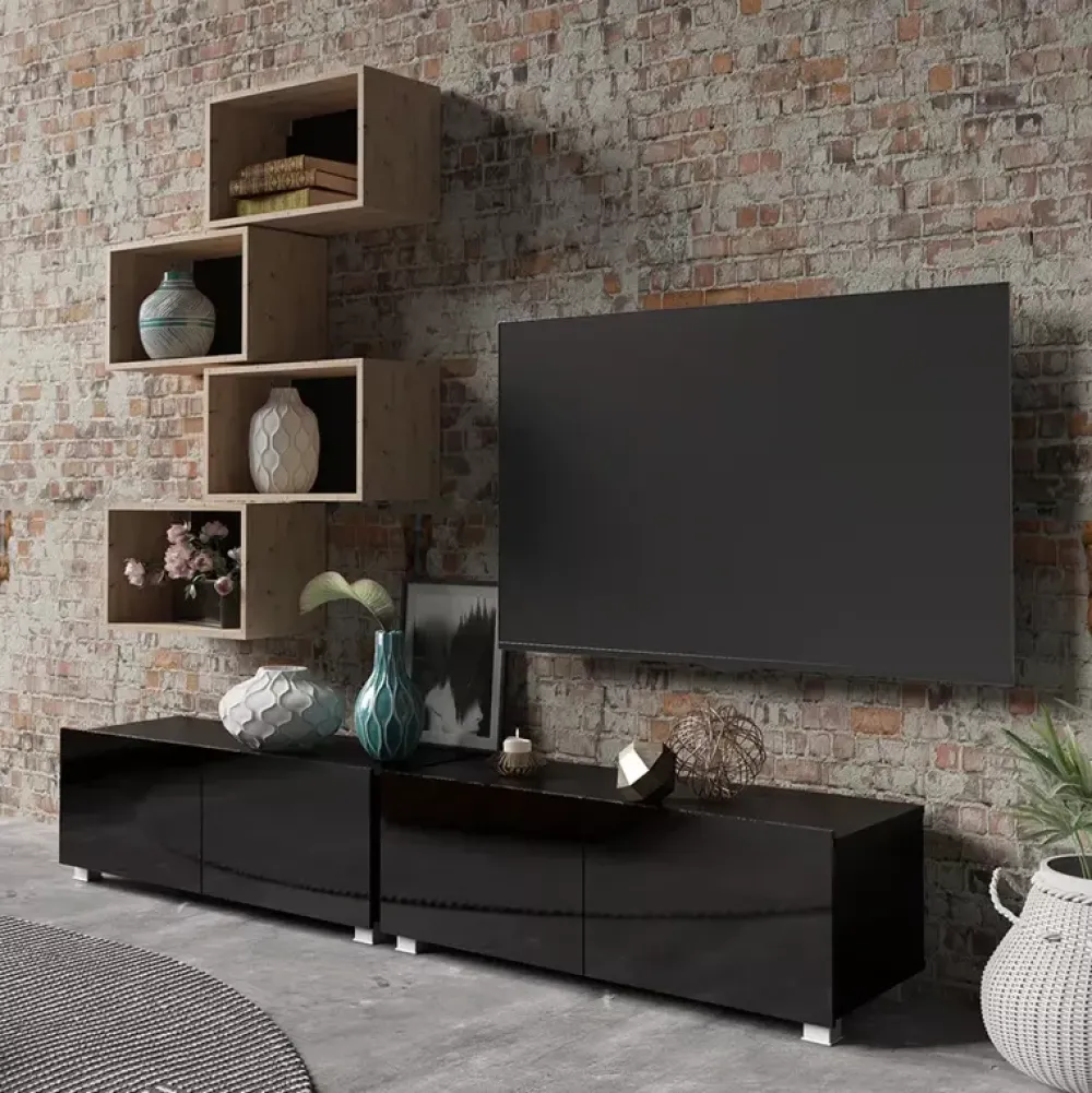 Zestaw MODERN w eleganckim czarnym połysku z ciepłymi akcentami dębu artisan to doskonały wybór do nowoczesnych i wyrazistych wnętrz. Składa się z sześciu elementów: dwóch kompaktowych szafek RTV o szerokości 100 cm oraz czterech półek wiszących, które pozwolą Ci stworzyć indywidualną i uporządkowaną przestrzeń w salonie.