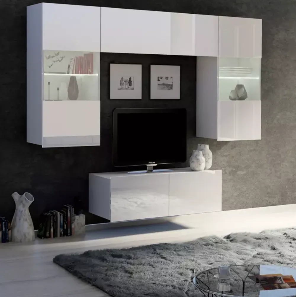 Zestaw MODERN w kolorze biały połysk to doskonałe rozwiązanie dla osób ceniących minimalistyczny design i funkcjonalność w niewielkiej przestrzeni. Naturalne wykończenie ociepla wnętrze, a nowoczesna forma bez uchwytów nadaje meblom lekkości. Zestaw składa się z dwóch witryn wiszących, jednej poziomej szafki wiszącej oraz kompaktowej szafki RTV o szerokości 100 cm.