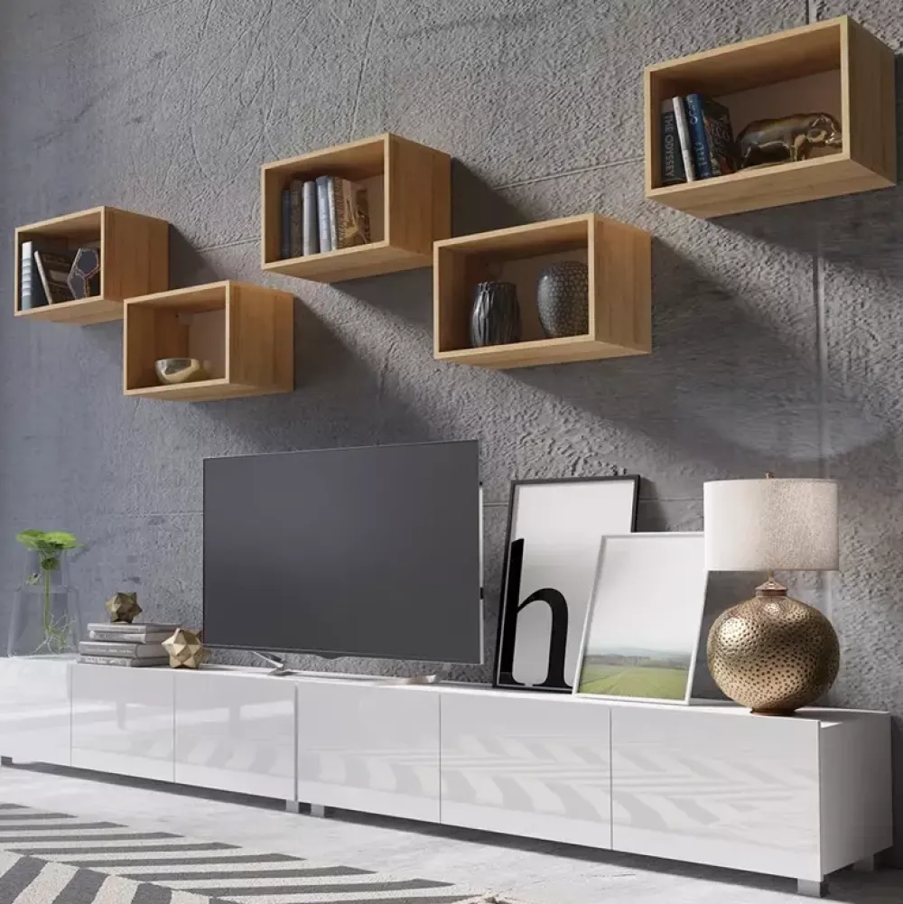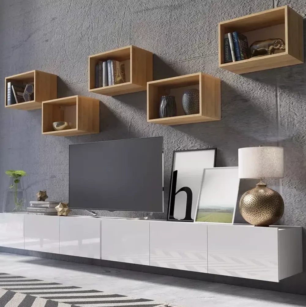 Zestaw MODERN w kolorze białego połysku z dodatkiem dębu złotego to idealne rozwiązanie do nowoczesnych wnętrz, w których liczy się zarówno styl, jak i funkcjonalność. Komplet składa się z siedmiu elementów: dwóch szafek RTV oraz pięciu półek wiszących o szerokości 50 cm jedna w ciepłym odcieniu drewna. Dzięki temu meblościanka prezentuje się lekko i przestrzennie, a jednocześnie oferuje wiele praktycznych rozwiązań do przechowywania.