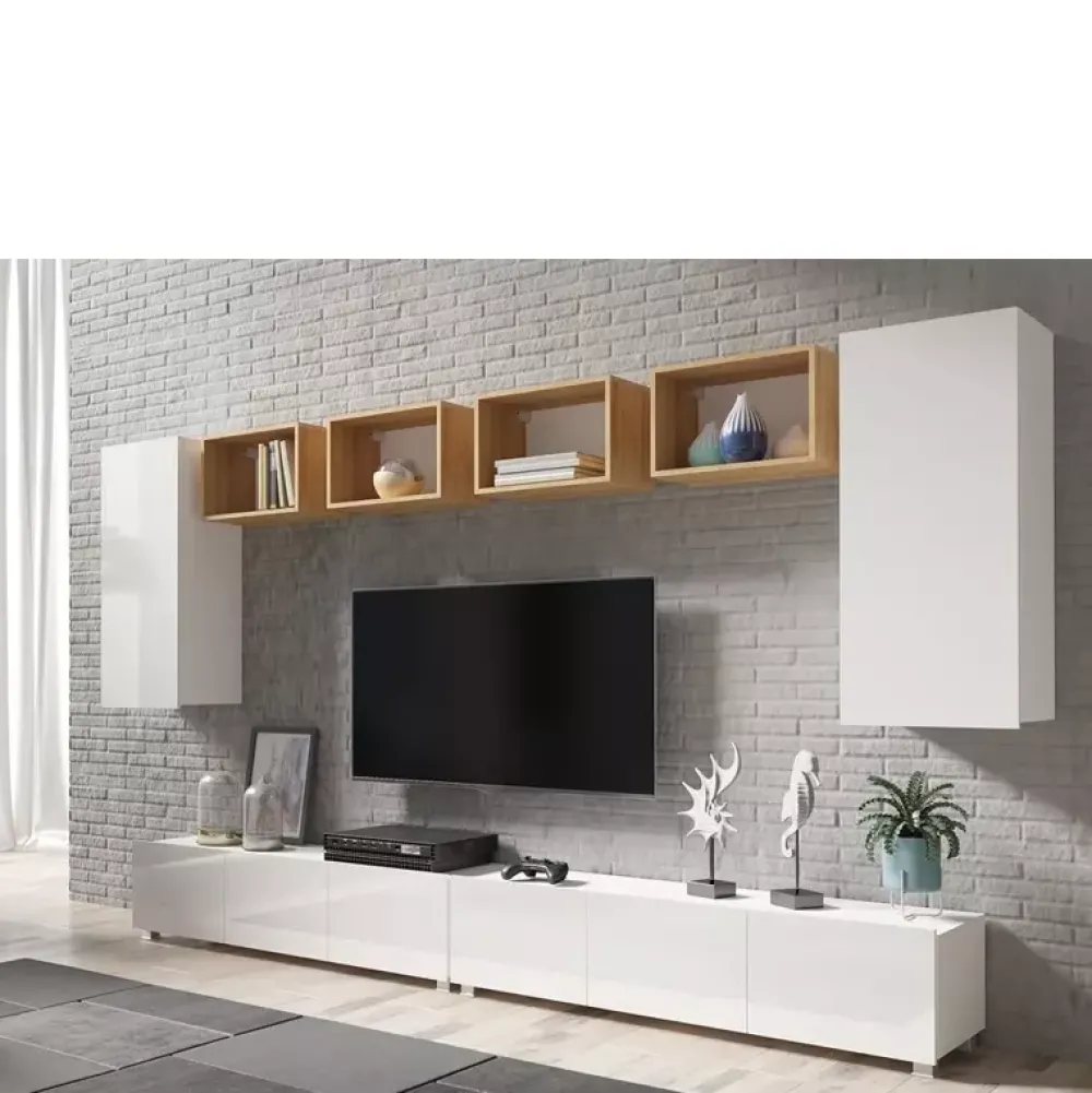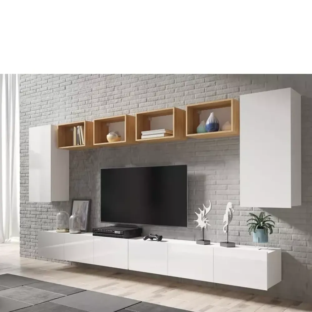 Odmień swój salon dzięki meblościance MODERN, która łączy minimalistyczny design z praktycznymi rozwiązaniami do przechowywania. Głęboka biel na wysoki połysk w połączeniu z ciepłym odcieniem dębu złotego tworzy harmonijną i elegancką kompozycję, która przyciąga wzrok i nadaje wnętrzu stylowego charakteru. Zestaw składa się z ośmiu elementów, które możesz dowolnie komponować, tworząc funkcjonalną i dopasowaną do przestrzeni aranżację.