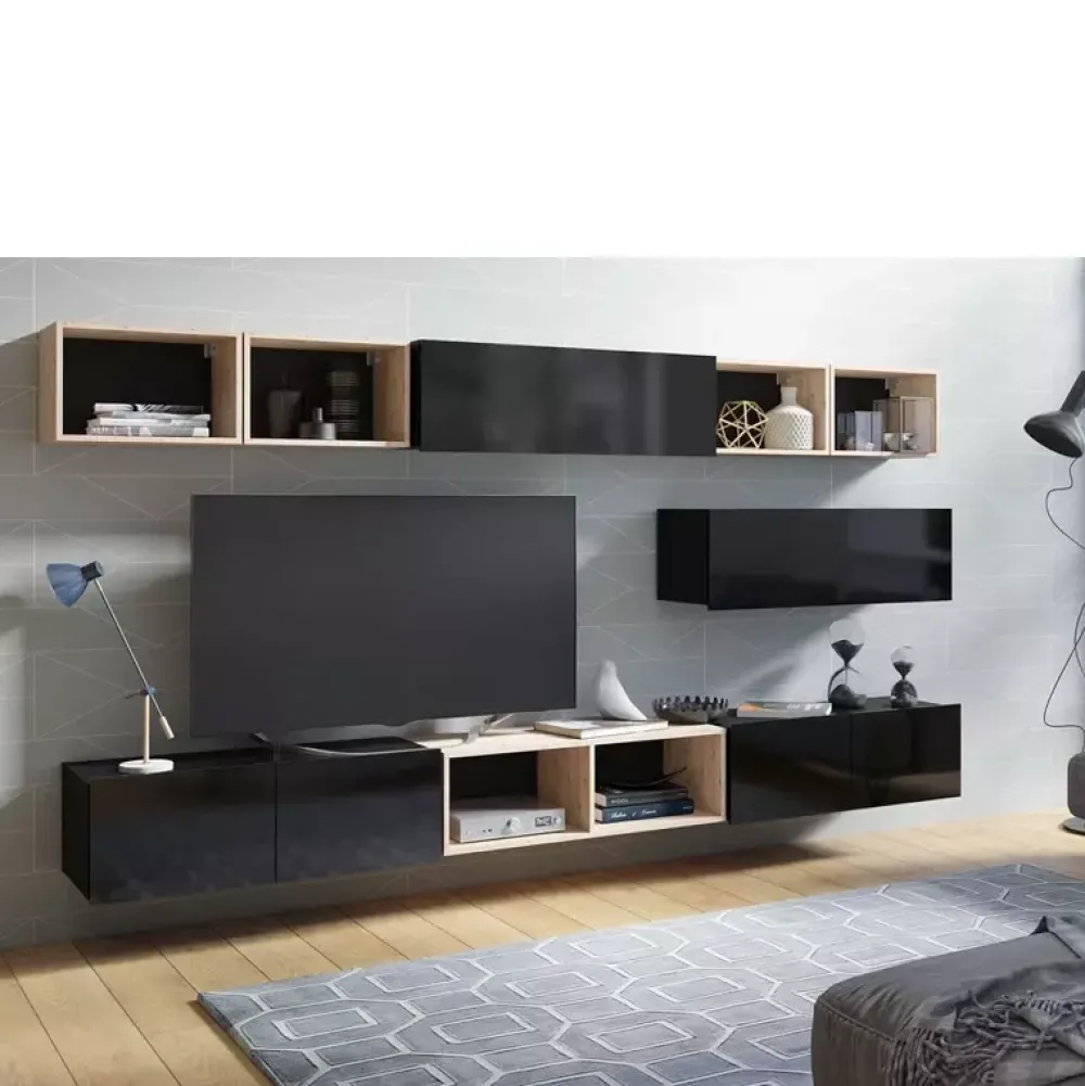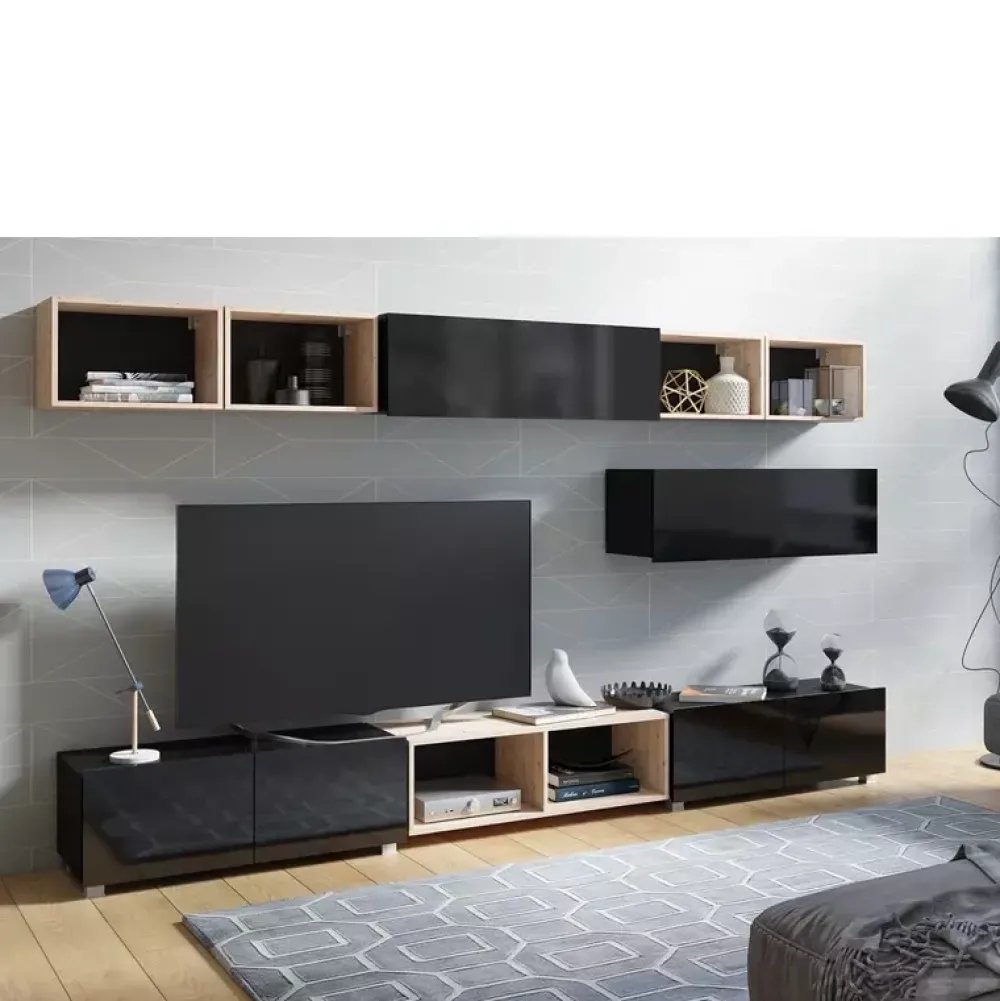 Zestaw MODERN to nowoczesna kompozycja mebli do salonu, która łączy połyskującą czerń z ciepłym odcieniem dębu artisan. Składający się z aż dziewięciu elementów zestaw pozwala na dowolne zaaranżowanie ściany w salonie – oferując zarówno funkcjonalność, jak i estetykę na najwyższym poziomie.