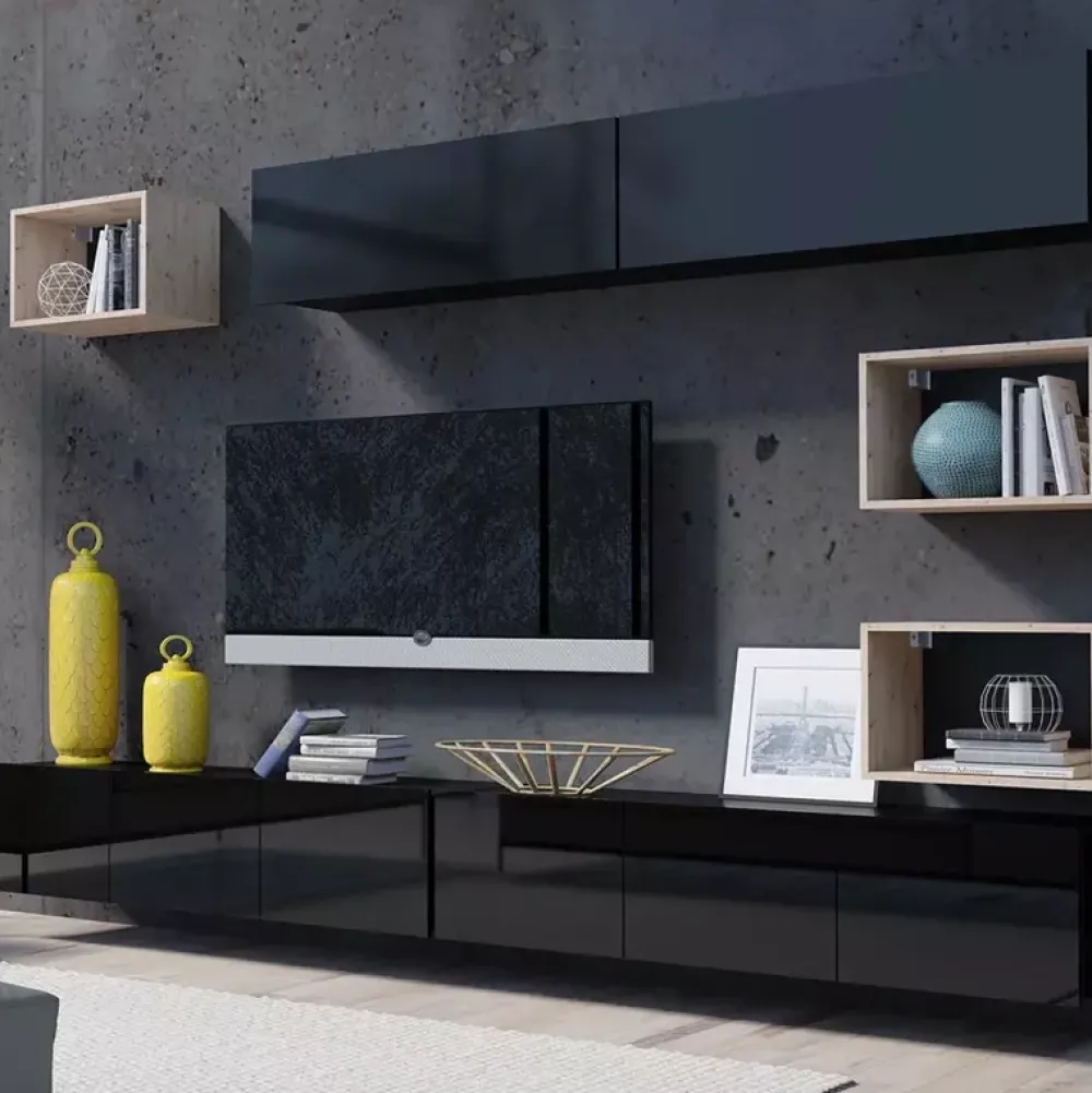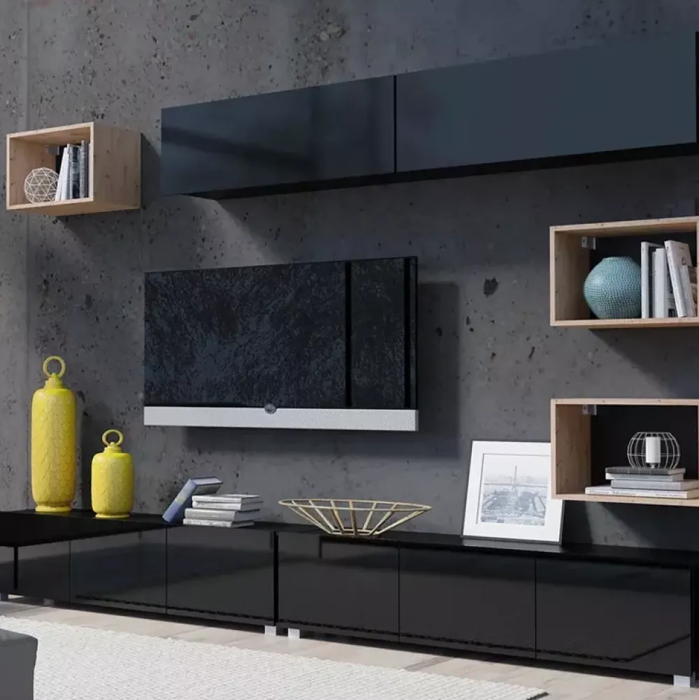 Zestaw MODERN w eleganckim czarnym połysku z akcentami w kolorze dąb artisan to harmonijne połączenie nowoczesnego stylu i praktycznych rozwiązań. Komplet składa się z siedmiu elementów: dwóch szafek RTV, dwóch poziomych szafek wiszących oraz trzech półek, co daje szerokie możliwości aranżacyjne i dużą funkcjonalność w codziennym użytkowaniu.