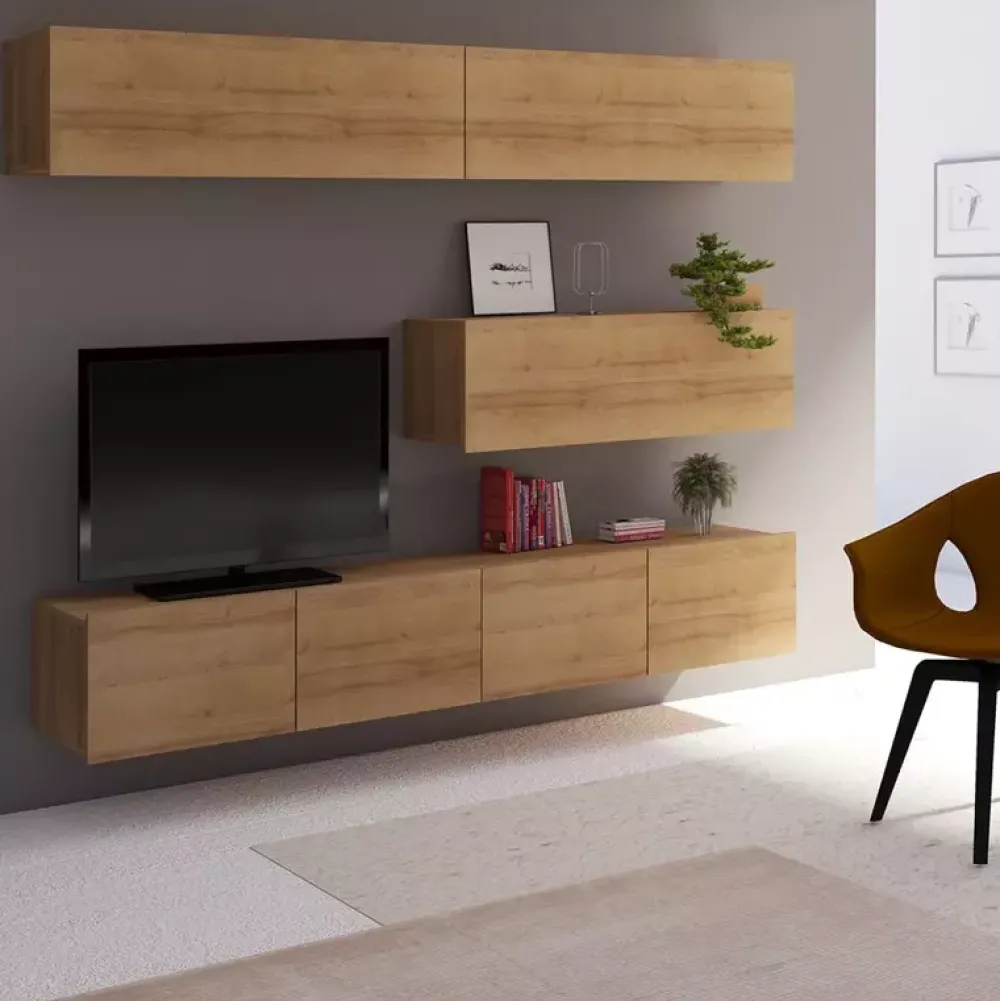 Zestaw składa się z trzech wiszących, poziomych szafek, które dodają do wnętrza klasy i szyku oraz dwóch pojemnych szafek RTV o szerokości 100 cm, które można zawiesić lub postawić na załączonych stopkach.