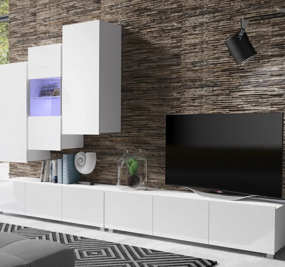 - Dwóch szafek RTV o szerokości 150 cm, dwóch szafek wiszących pionowych oraz witryny, którą można podświetlić oświetleniem LED. Kolor biały połysk