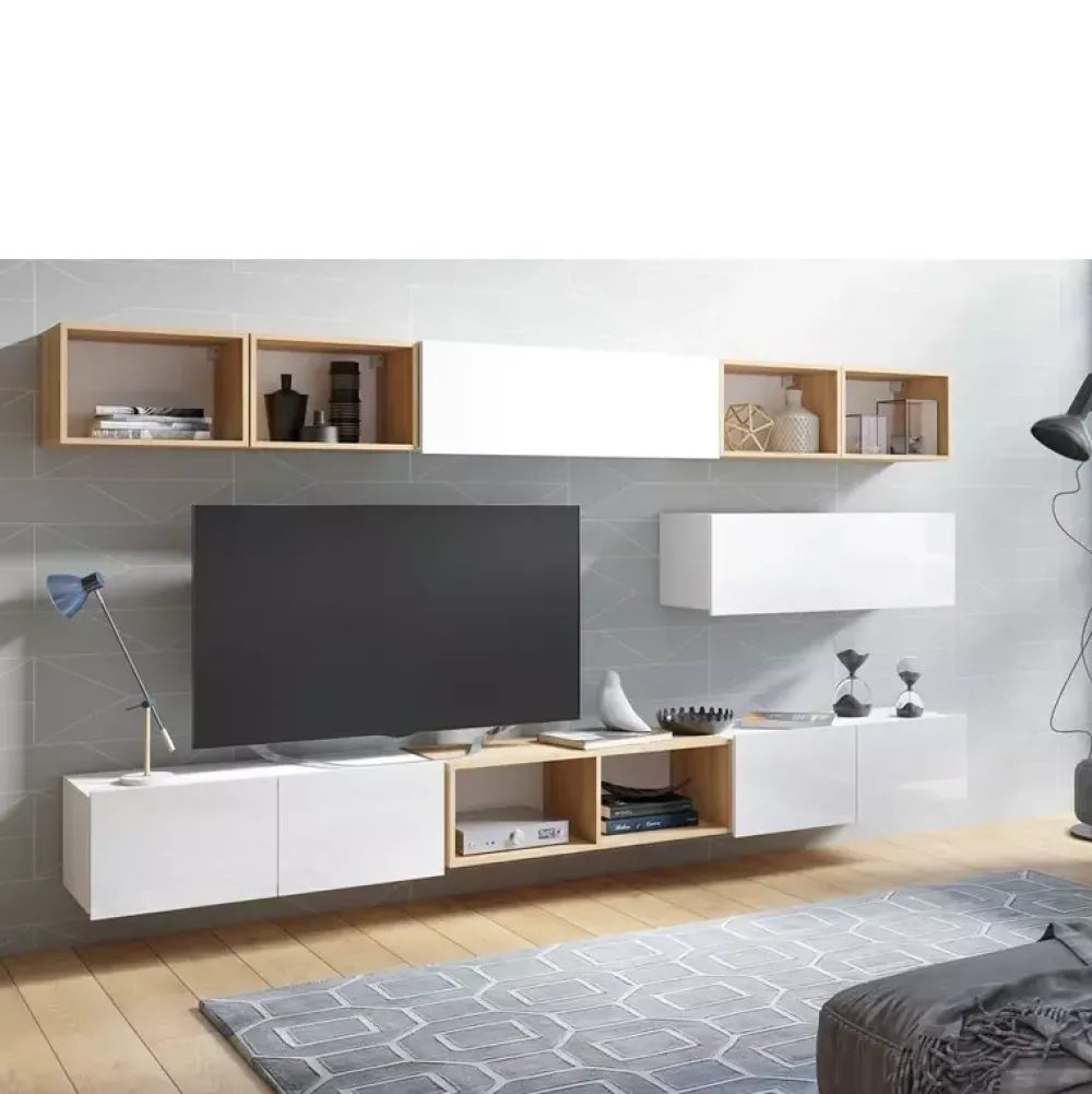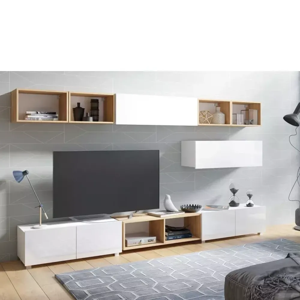 Zestaw MODERN to nowoczesna kompozycja mebli do salonu, która łączy połyskującą biel z ciepłym odcieniem dębu złotego. Składający się z aż dziewięciu elementów zestaw pozwala na dowolne zaaranżowanie ściany w salonie – oferując zarówno funkcjonalność, jak i estetykę na najwyższym poziomie.