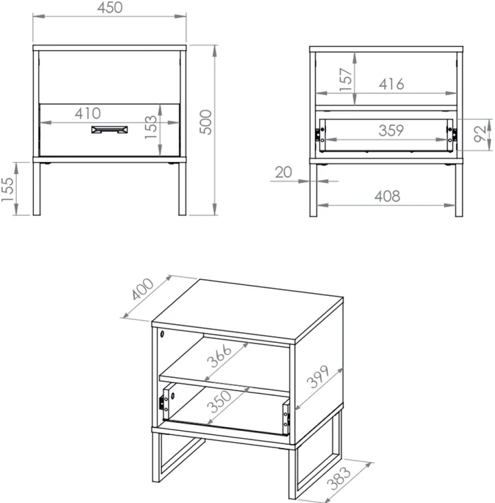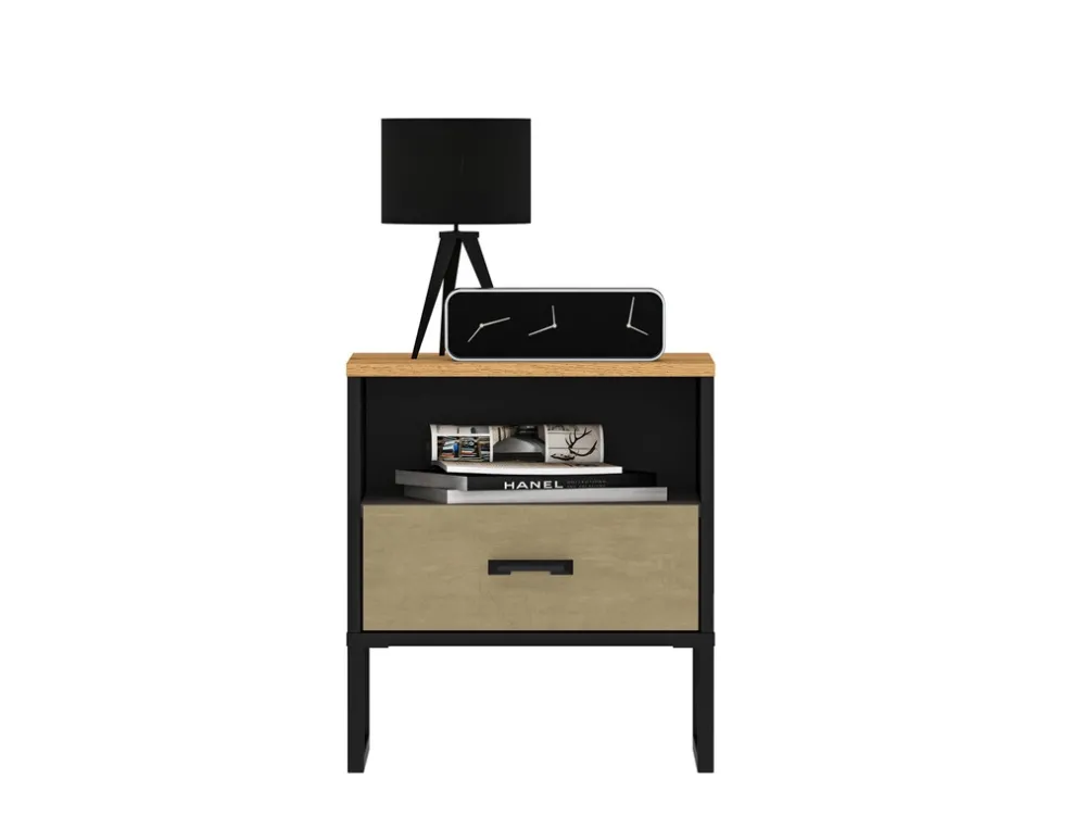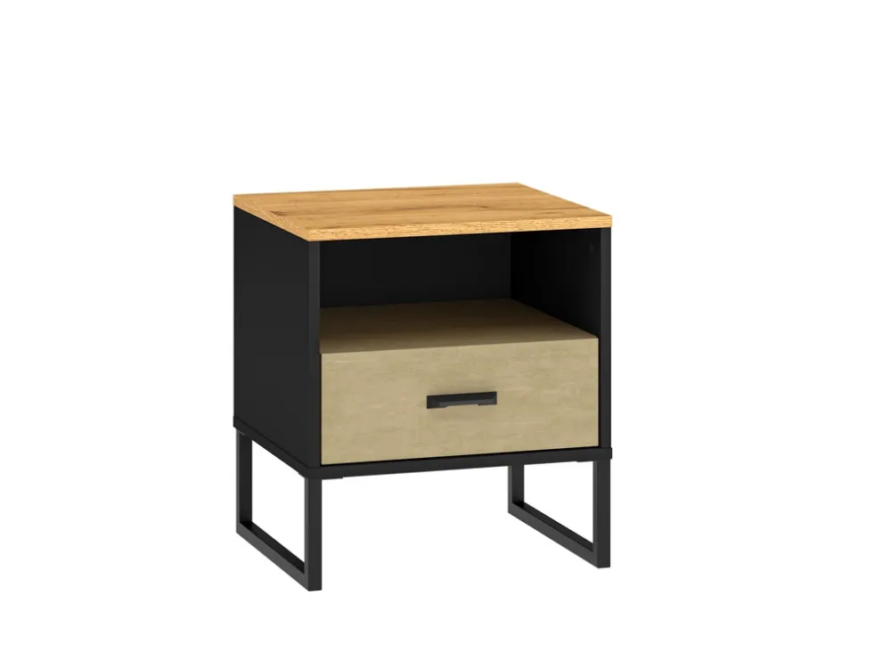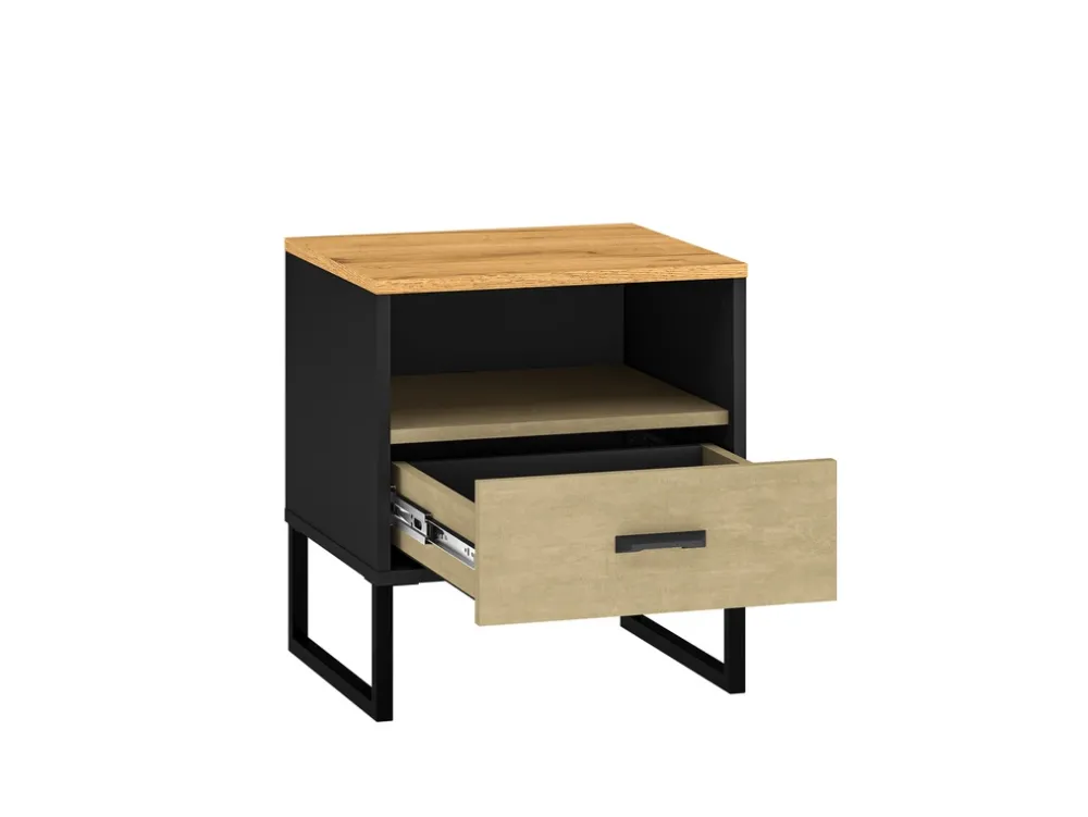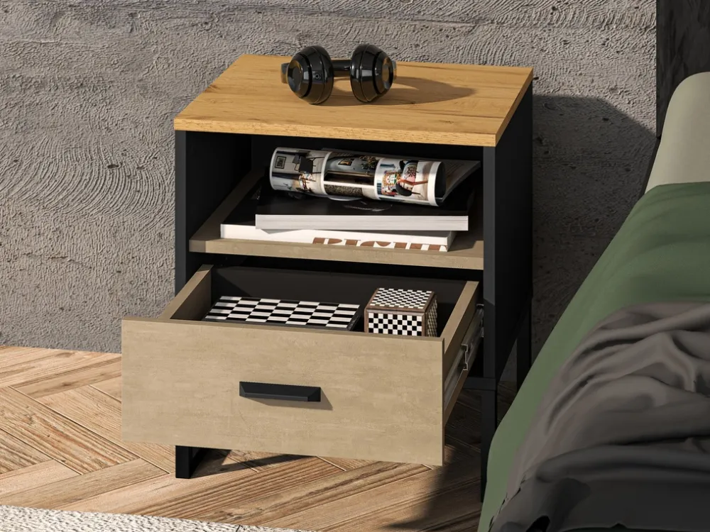 - Szafka nocna do pokoju młodzieżowego COLT został wykonany z płyty laminowanej, krawędzie zabezpieczone dodatkowo okleiną ABS. Nóżki i uchwyty wykonane z metalu w kolorze czarnym. Szafka posiada pojemną szufladę na prowadnicach kulkowych.