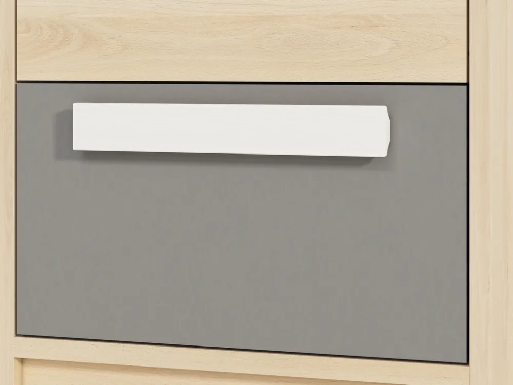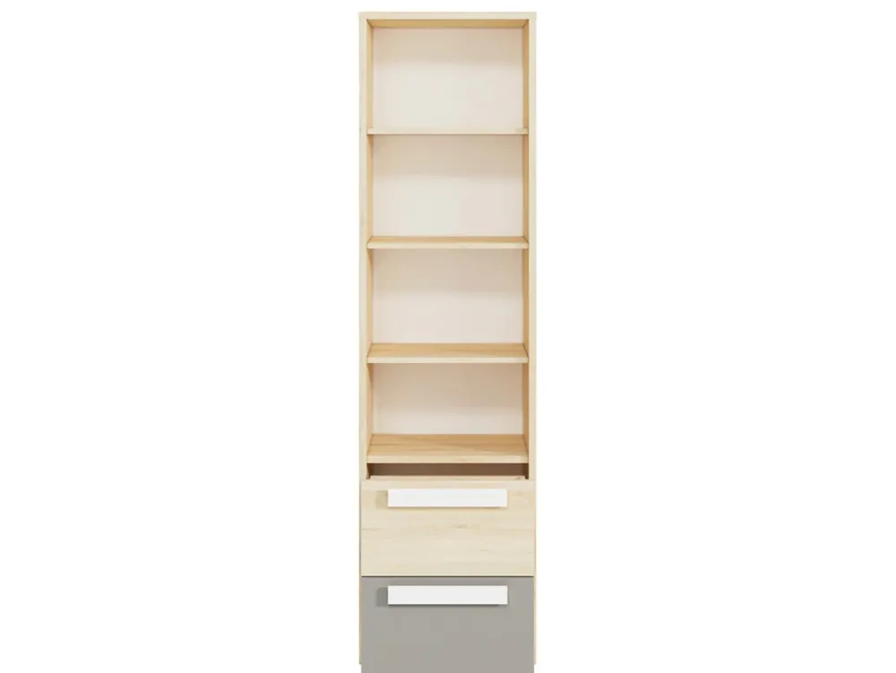 Regał został wyposażony w dwie przestronne szuflady na prowadnicach kulkowych, które zapewniają wygodę i komfort użytkowania. Szuflady otwierają się lekko i bezszelestnie, co jest szczególnie ważne w codziennym użytkowaniu. Pomieszczą one wszystkie niezbędne drobiazgi, książki czy akcesoria szkolne, pomagając utrzymać porządek w pokoju.