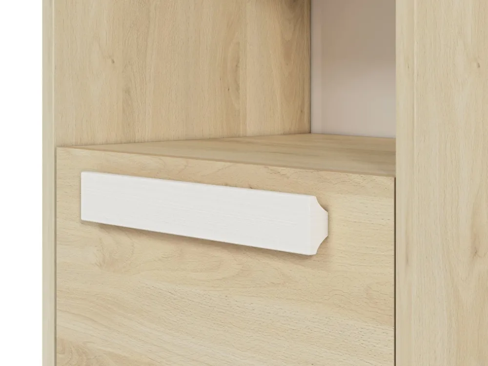 Eleganckie uchwyty wykonane z drewna w kolorze białym dodają regałowi stylu i nowoczesnego charakteru. Są one nie tylko estetyczne, ale także ergonomiczne, co ułatwia codzienne użytkowanie.