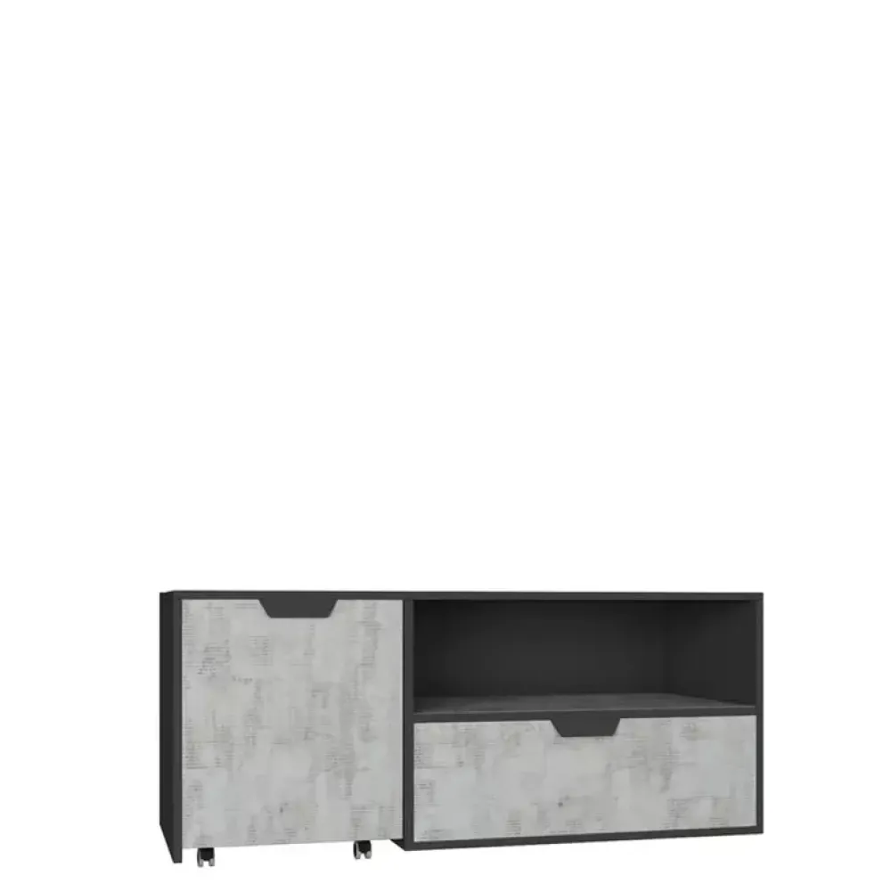 - Szafka RTV jest dostępna w dwóch wariantach kolorystycznych: Grafit + Enigma oraz Grafit + Dąb Rivera.