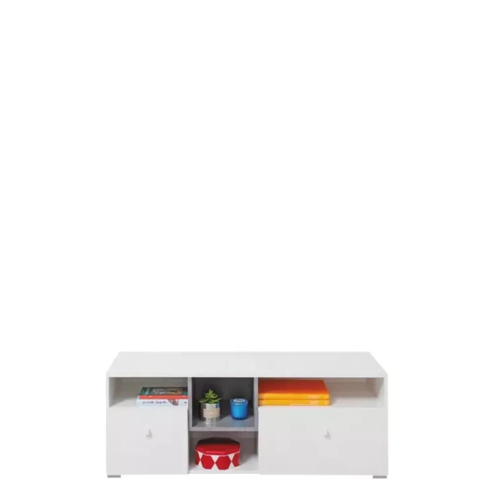 - Młodzieżowa szafka RTV o szerokości 120 cm. Wyposażona w cztery wnęki kompaktowe wnęki na sprzęt RTV, oraz dwie pojemne szuflady na gry, filmy i inne akcesoria.