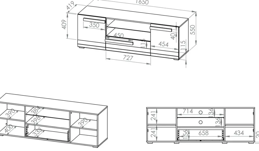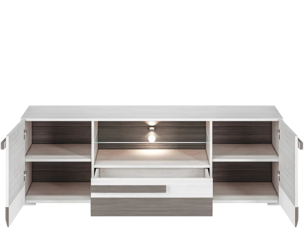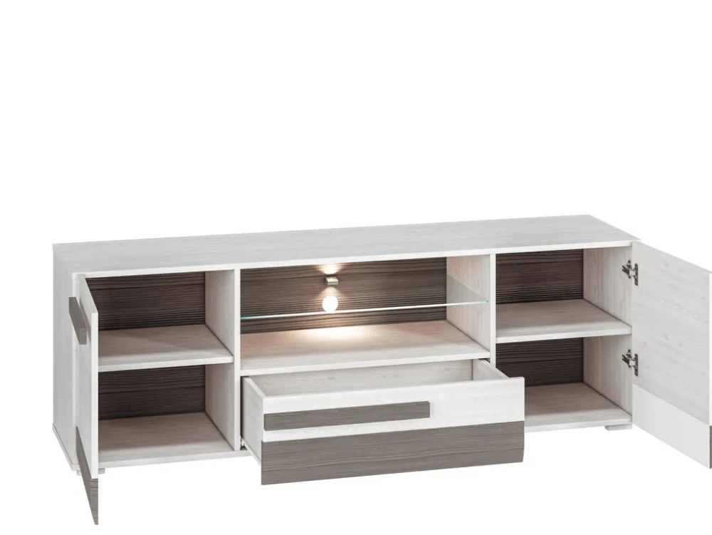 - Szafka RTV 165 cm BLANCO posiada drzwi po swojej lewej i prawej stronie, za którymi znajduje się półka. Po środku szafki znajdują się dwie półki na dekoracje i sprzęt RTV oraz szuflada na prowadnicach rolkowych u dołu.