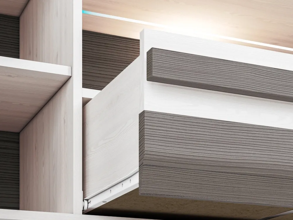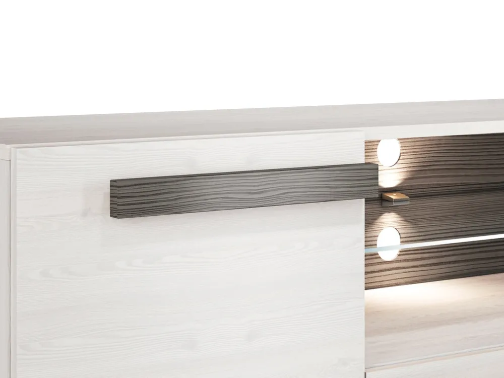 Uchwyty wykonane z płyty MDF to nie tylko funkcjonalny element, ale również stylowy akcent, który podkreśla nowoczesny charakter szafki RTV. Ich minimalistyczny design idealnie komponuje się z kolorem sosny śnieżnej, dodając meblowi elegancji i subtelnego uroku.