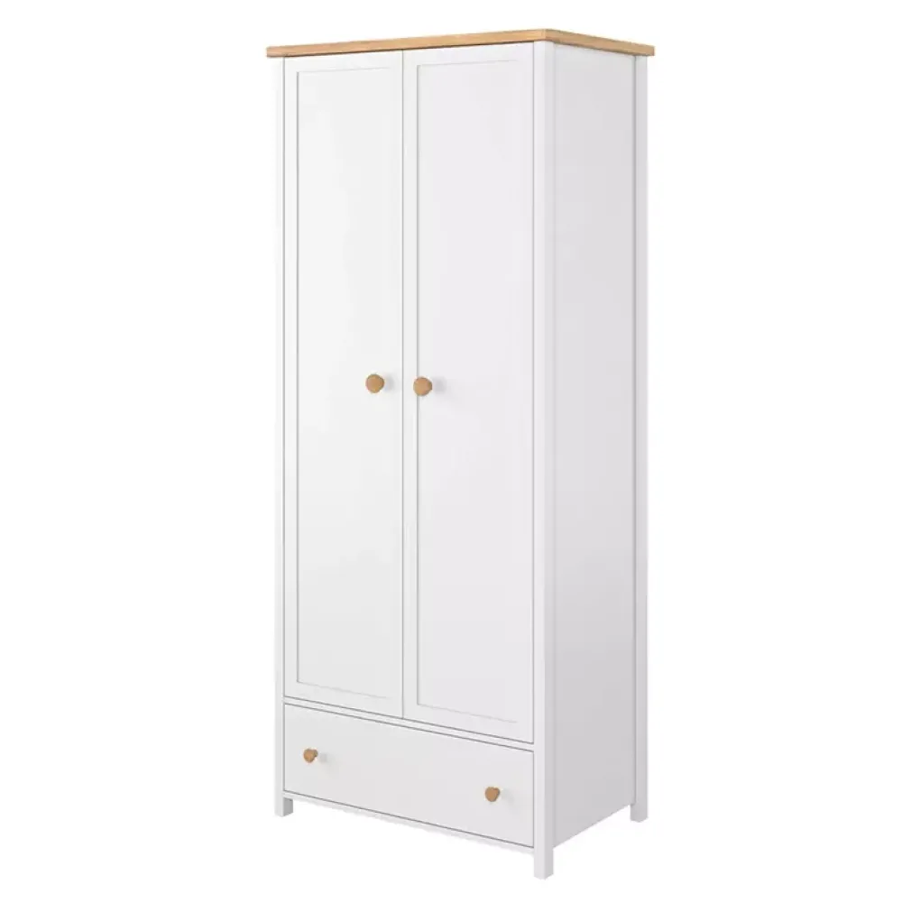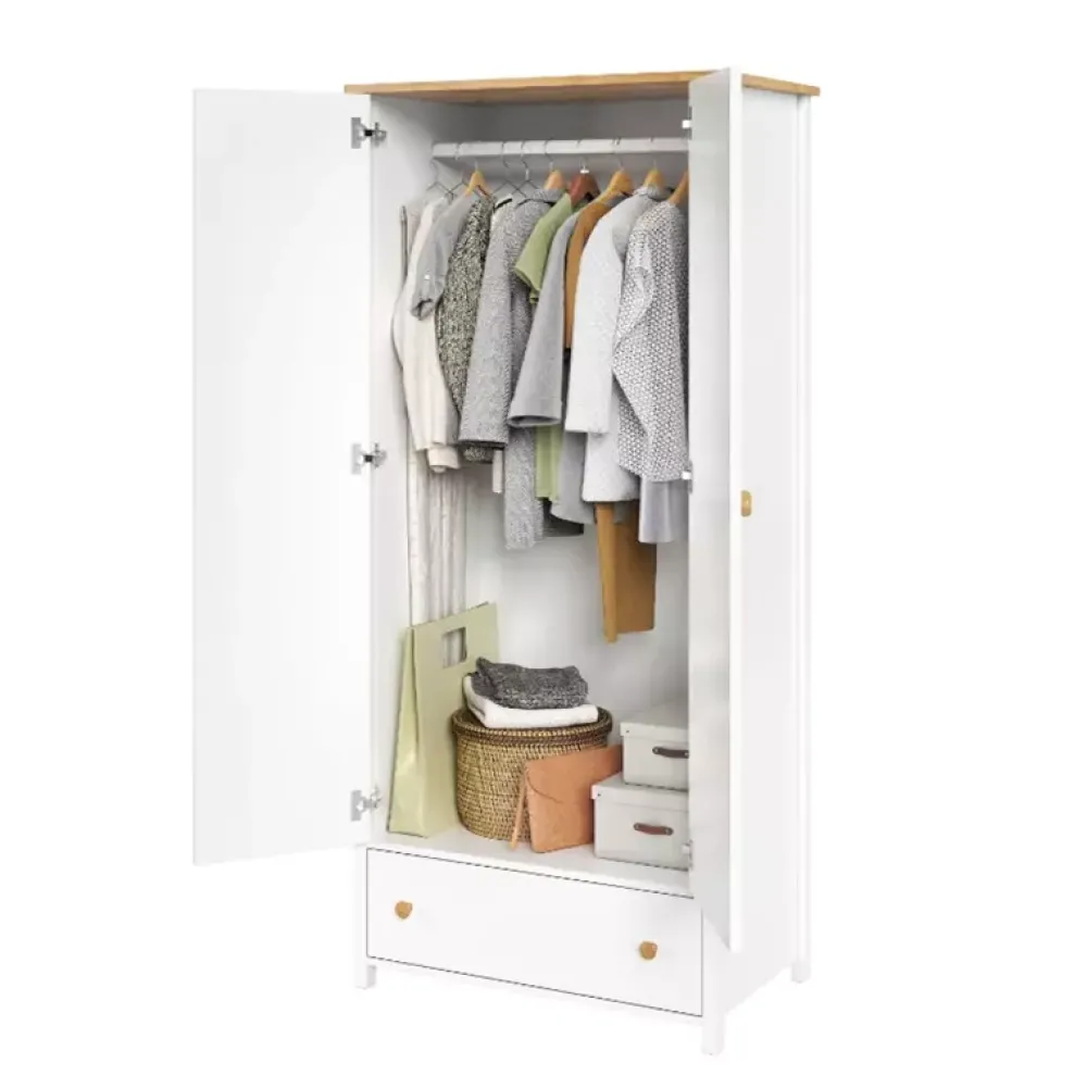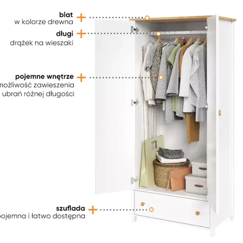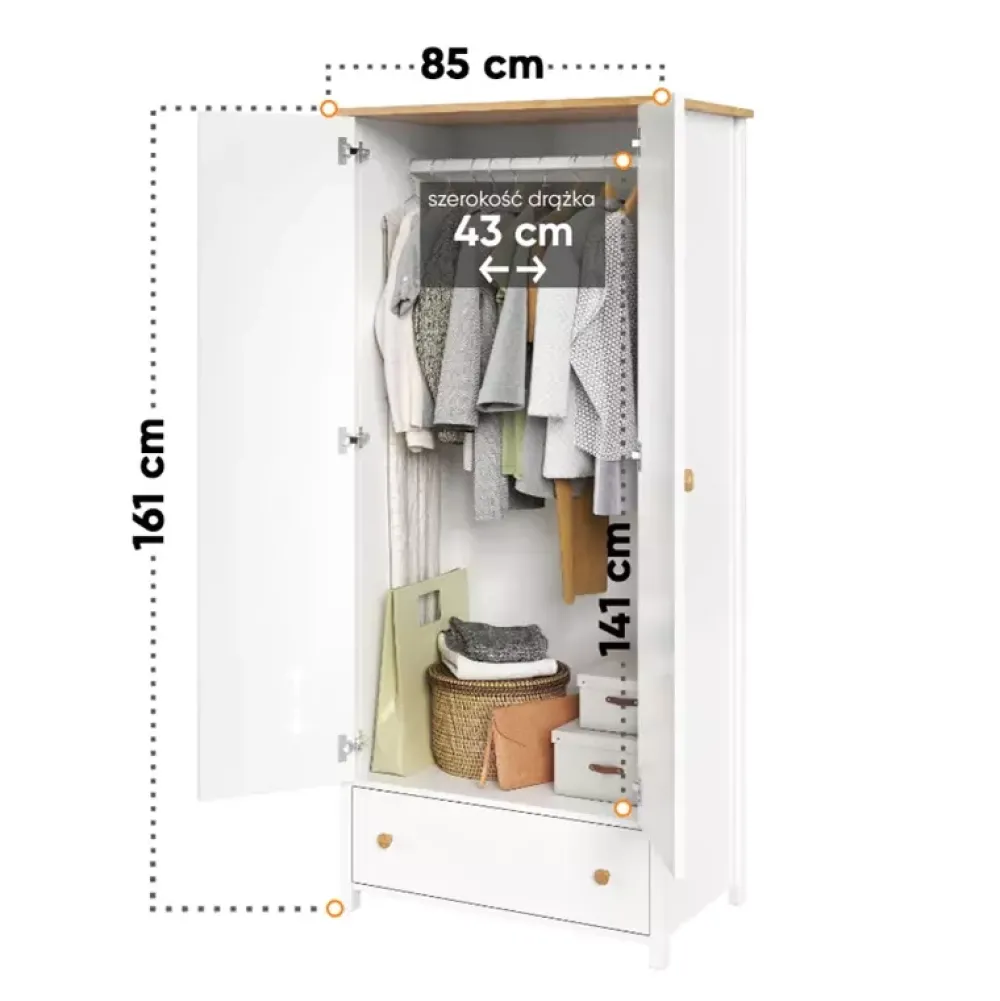 - Biała szafa młodzieżowa STORY o szerokości 85 cm została wyposażona w pojemną szufladę na akcesoria u dołu, nad którą znajduje się para drzwi osadzona na zawiasach puszkowych. Za drzwiami szafy swoje miejsce znalazł drążek na wieszaki.