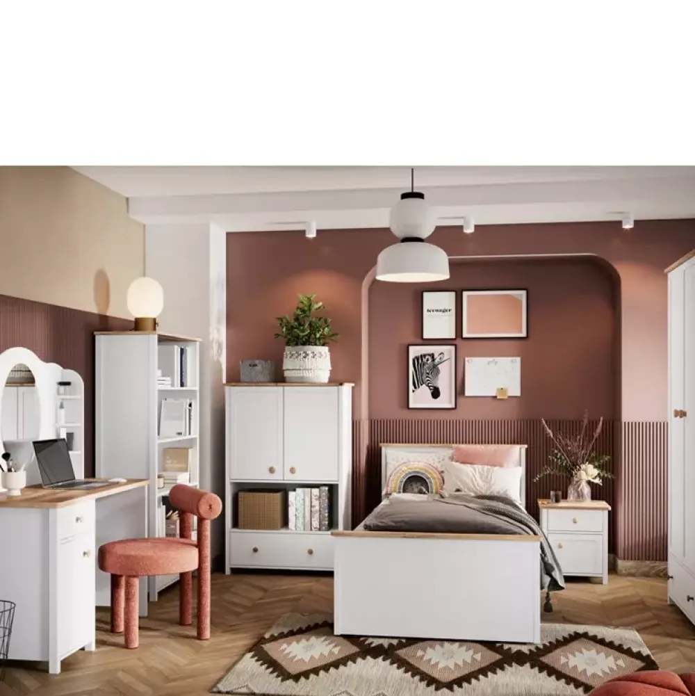 Dodatkowo, dzięki szufladzie, można przechowywać drobiazgi w jednym miejscu. Wysokie nóżki dodają eleganckiego wyglądu, a kolor beli alpejskiej sprawia, że szafa z drążkiem na wieszaki STORY będzie pasować do wielu różnych aranżacji pokoi młodzieżowych.