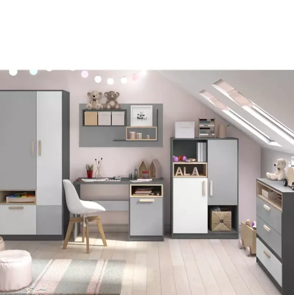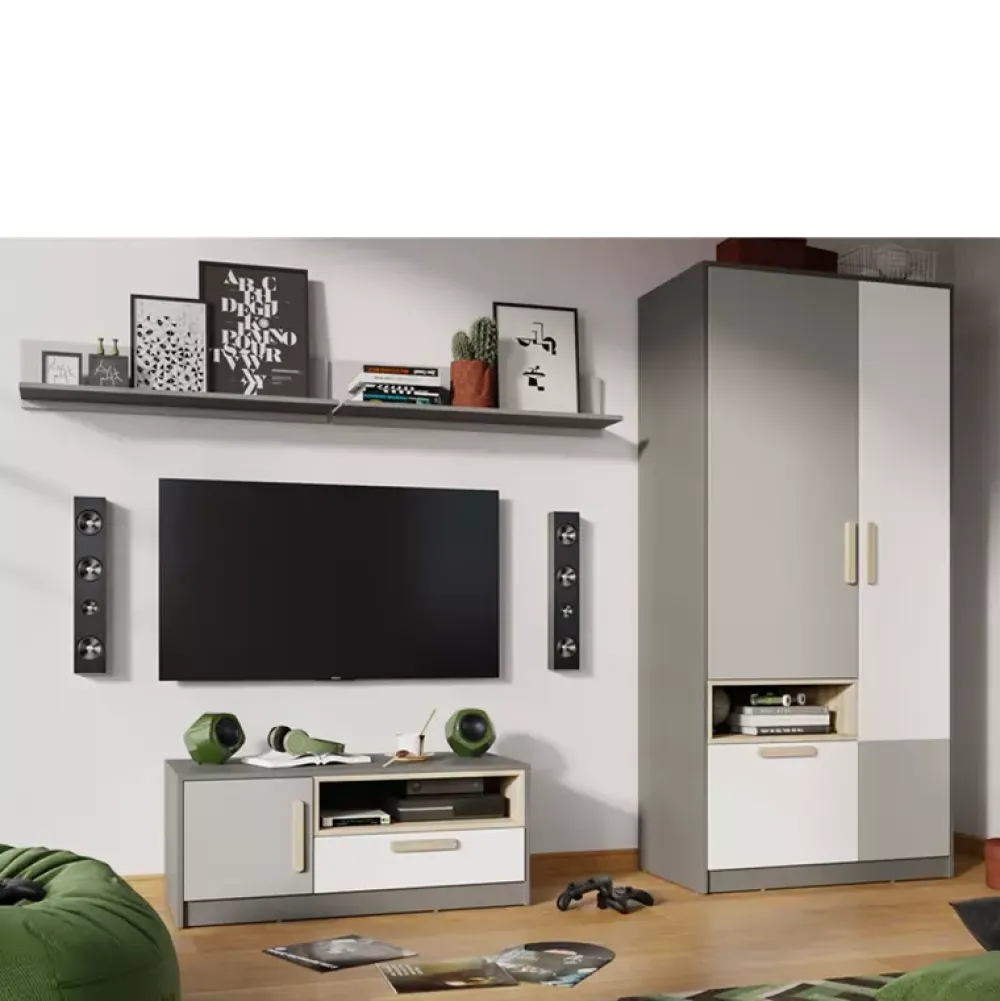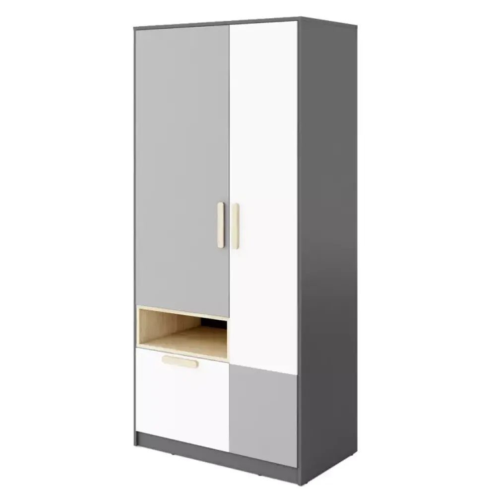 - Młodzieżowa szafa POK została wyposażona w parę drzwi osadzonych na zawiasach puszkowych, za którymi znajduje się drążek na wieszaki oraz półka nad nim. Dodatkowo szafa została wyposażona pojemną szufladę oraz otwartą wnękę na akcesoria.