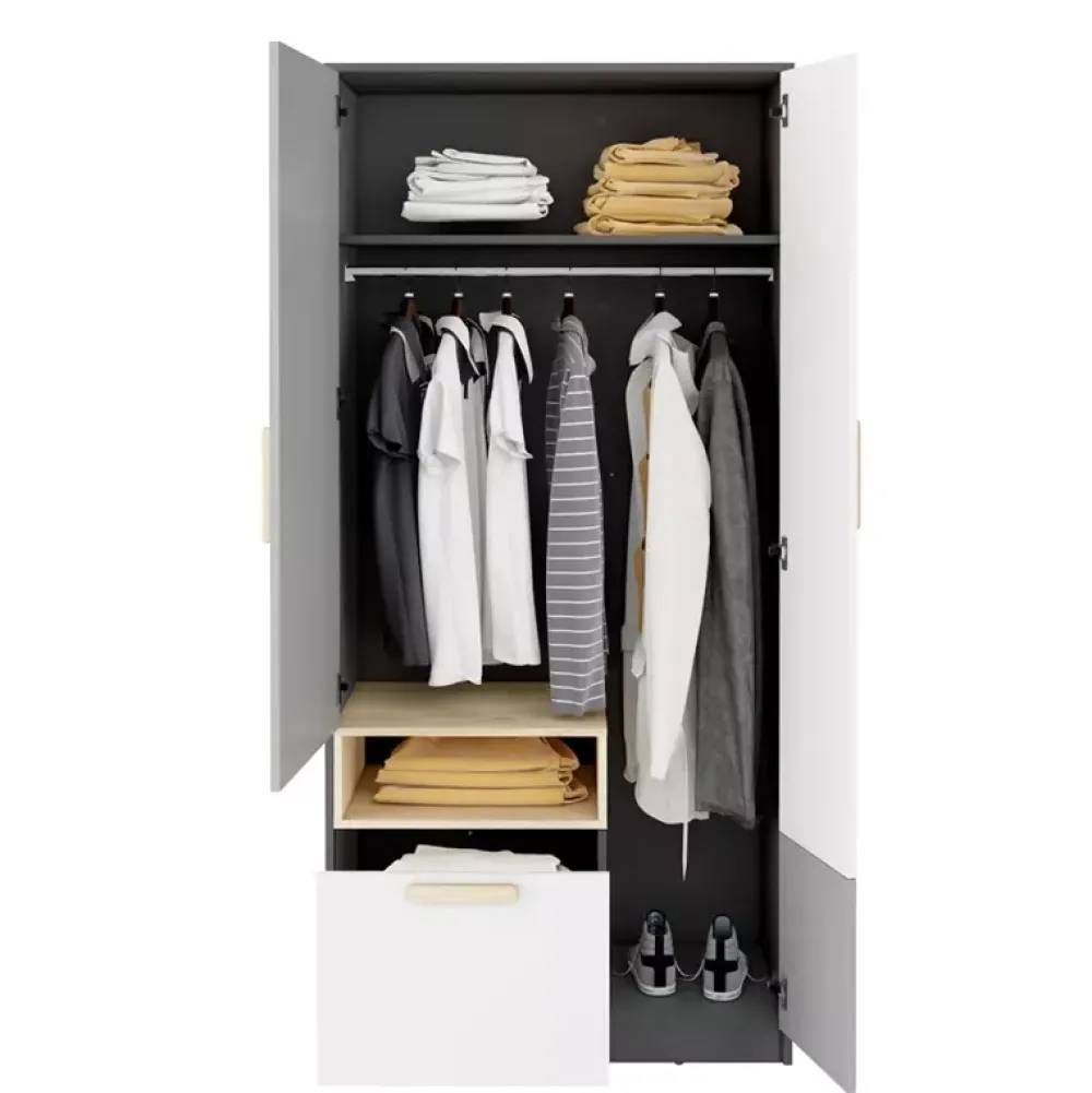 Szafa młodzieżowa POK została wyposażona w parę drzwi osadzonych na zawiasach puszkowych, za którymi znajduje się drążek na wieszaki oraz półka nad nim. Młodzieżowa szafa dwudrzwiowa została również wyposażona w pojemną szufladę osadzoną na prowadnicach kulkowych, która doskonale sprawdzi się do zagospodarowania drobniejszymi elementami garderoby oraz rozmaitymi książkami czy akcesoriami.