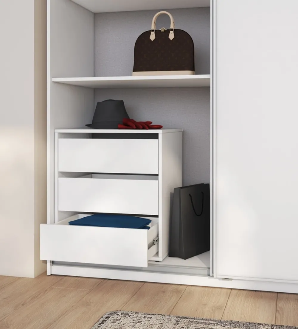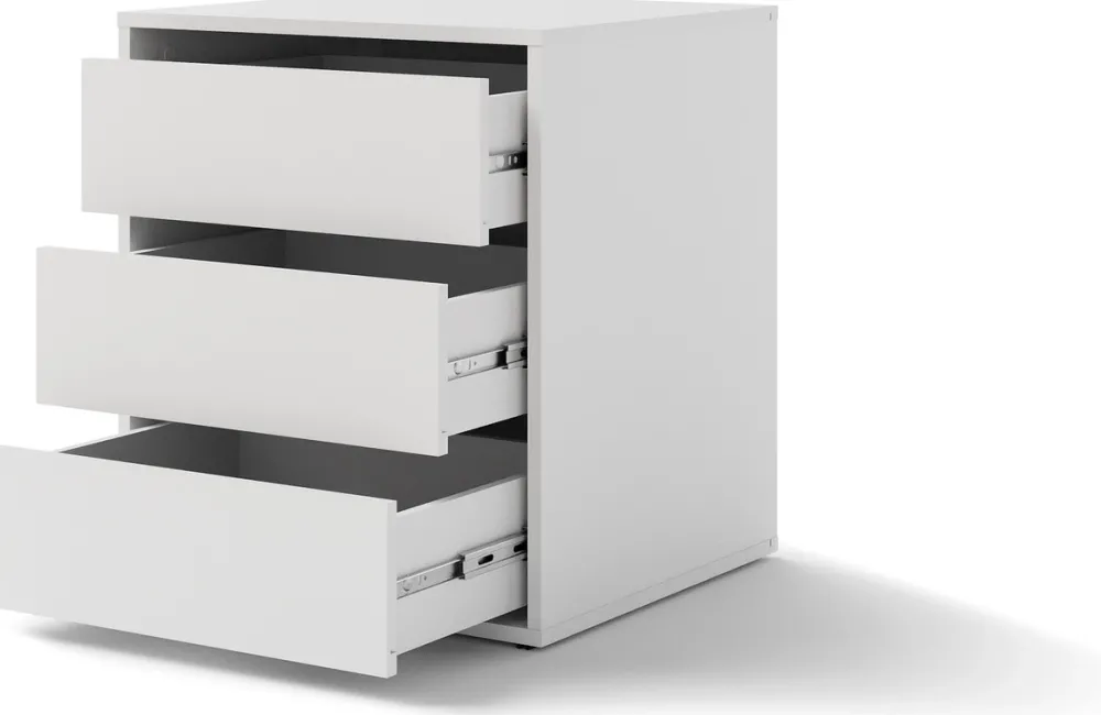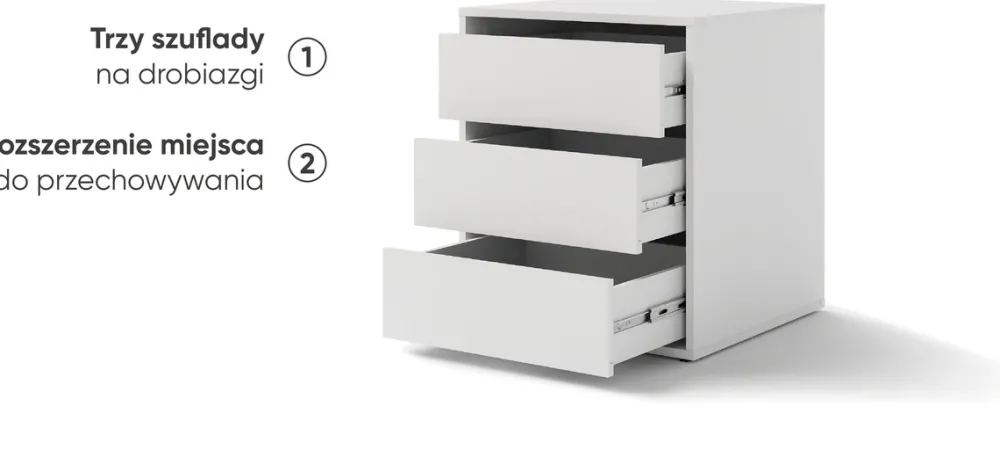 - Biały kontenerek do szafy przesuwnej MAXI posiada trzy przestronne szuflady idealne na drobiazgi i mniejsze przedmioty. Kontenerek nie posiada uchwytów, otwiera się poprzez złapanie za krawędź szuflady. Szuflady poruszają się na prowadnicach kulkowych.