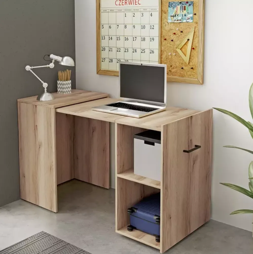Biurko SEMARENO zostało wyposażone w funkcję składania, która pozwala w prosty oraz szybki sposób na zamianę niewielkiej szafki w pełnowymiarowe biurko, które gwarantuje komfortową ilość miejsca do nauki oraz spędzania czasu przy komputerze oraz laptopie. Dodatkowo biurko po rozłożeniu posiada dwa poziomy na książki oraz rozmaite drobne akcesoria.