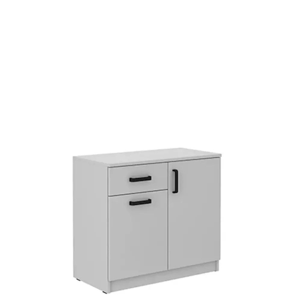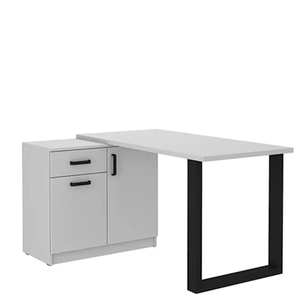 - Komoda z szufladą i półkami w zestawie z biurkiem na metalowych nogach. Duży blat zapewni wygodne miejsce do pracy.