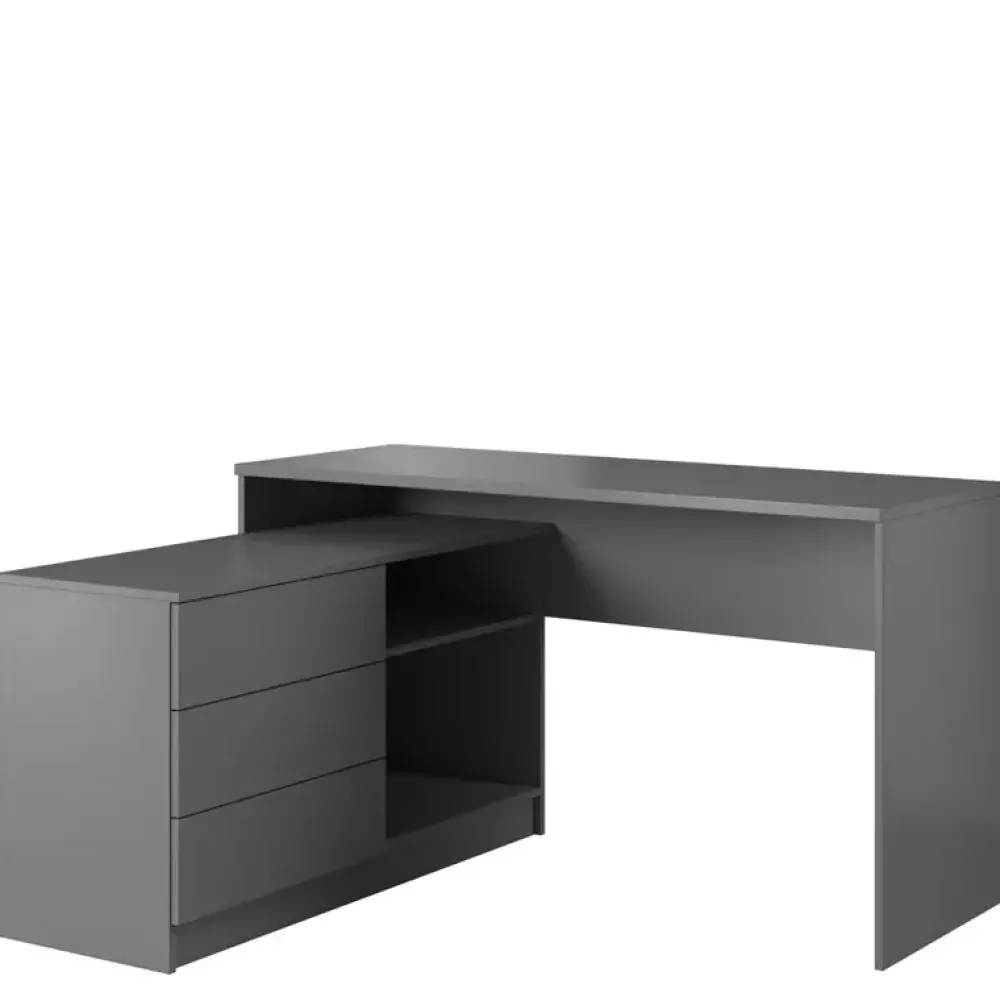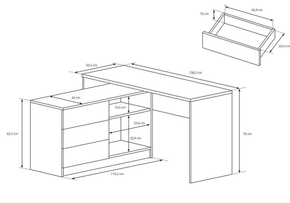 - Biurko z podwójnym blatem wyposażone w trzy szuflady i półkę.