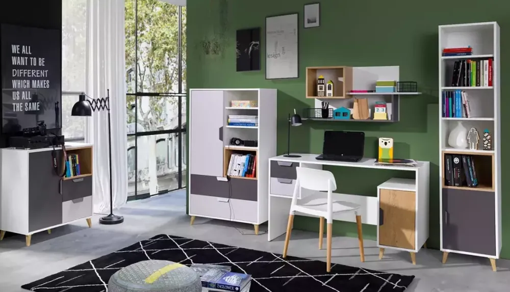Meble młodzieżowe z kolekcji JORK to piętnaście nowoczesnych brył takich jak; łóżko 90×200, szafa z półkami i szufladami, komoda wysoka i niska czy biurko młodzieżowe, z pomocą których stworzysz nietuzinkowe wnętrze dla nastolatka. Połączenie czterech dopasowanych do siebie kolorów nadało całej kolekcji oryginalnego charakteru, co dorastający człowiek z pewnością doceni. Meble systemowe to praktyczne rozwiązanie, ponieważ możesz dostawiać do posiadanych brył kolejne, z tej samej kolekcji, tworząc dodatkowe miejsce do przechowywania, nauki czy wypoczynku.