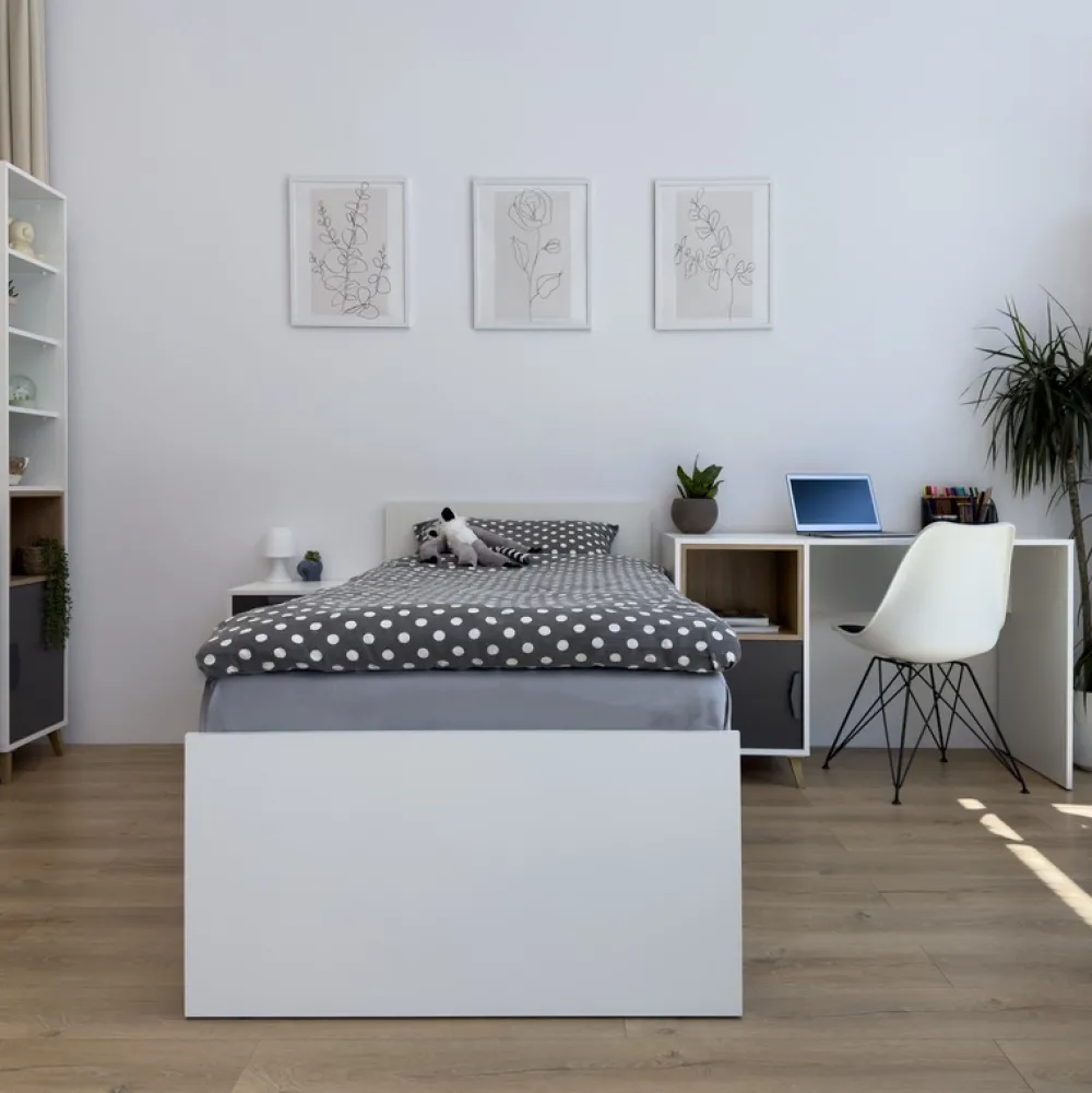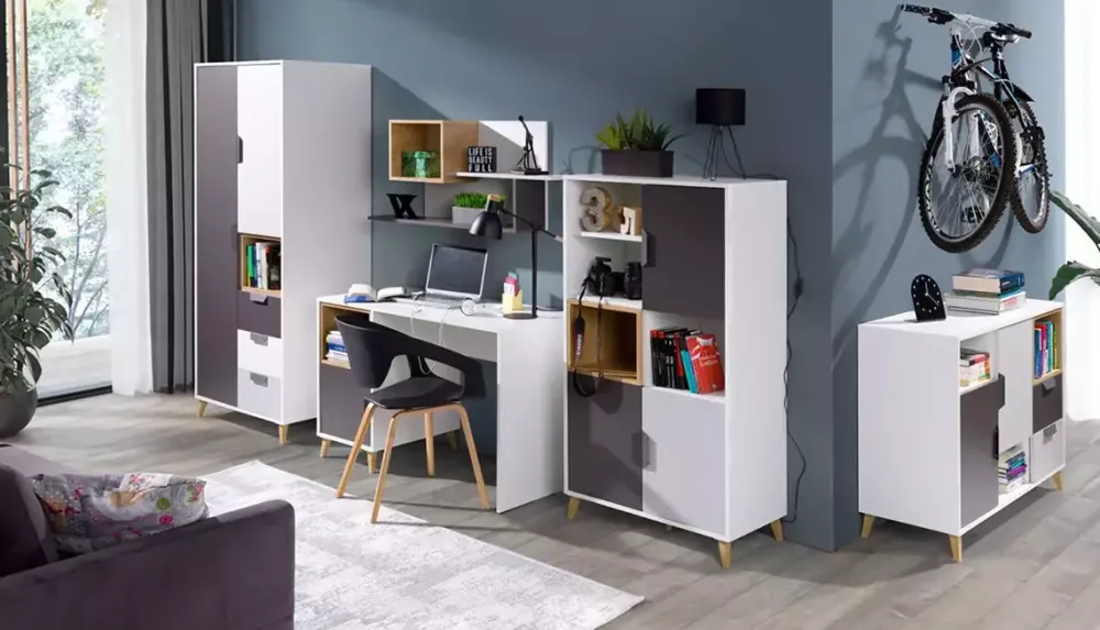Meble młodzieżowe z kolekcji JORK to piętnaście nowoczesnych brył takich jak; łóżko 90×200, szafa z półkami i szufladami, komoda wysoka i niska czy biurko młodzieżowe, z pomocą których stworzysz nietuzinkowe wnętrze dla nastolatka. Połączenie czterech dopasowanych do siebie kolorów nadało całej kolekcji oryginalnego charakteru, co dorastający człowiek z pewnością doceni. Meble systemowe to praktyczne rozwiązanie, ponieważ możesz dostawiać do posiadanych brył kolejne, z tej samej kolekcji, tworząc dodatkowe miejsce do przechowywania, nauki czy wypoczynku.