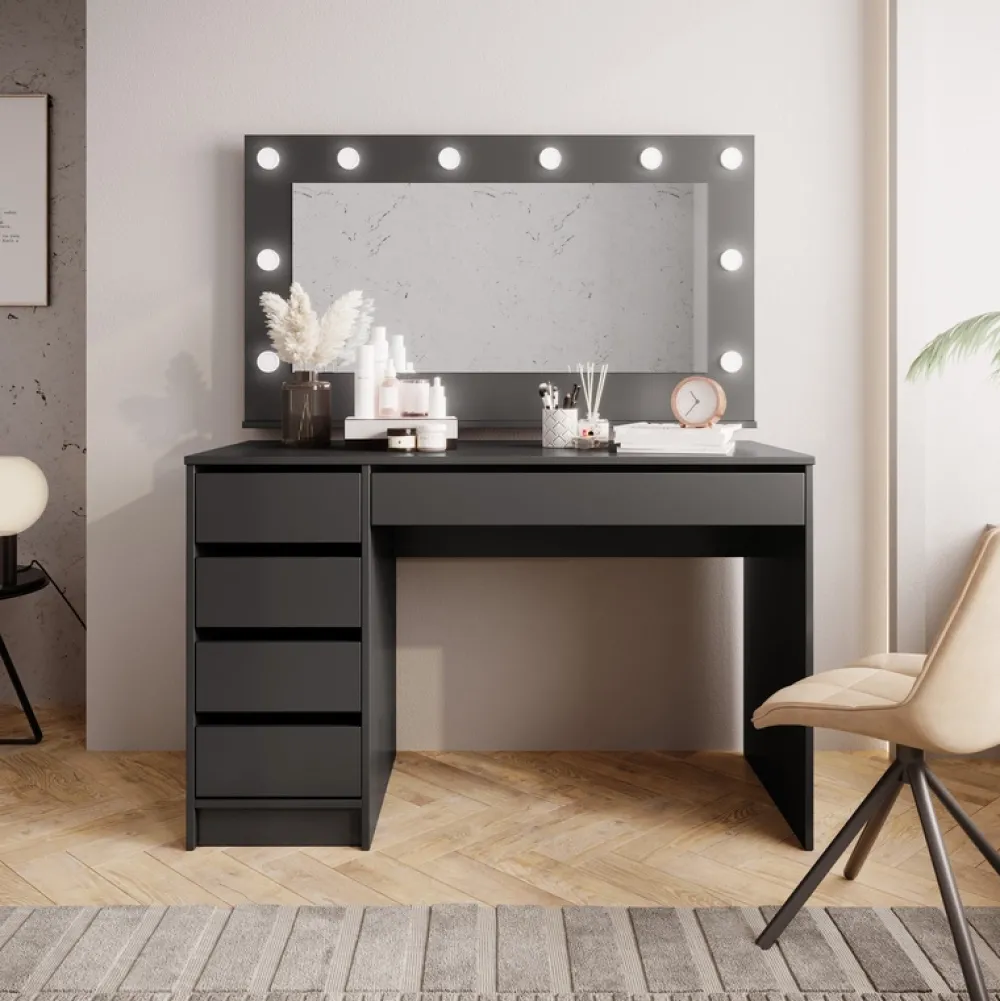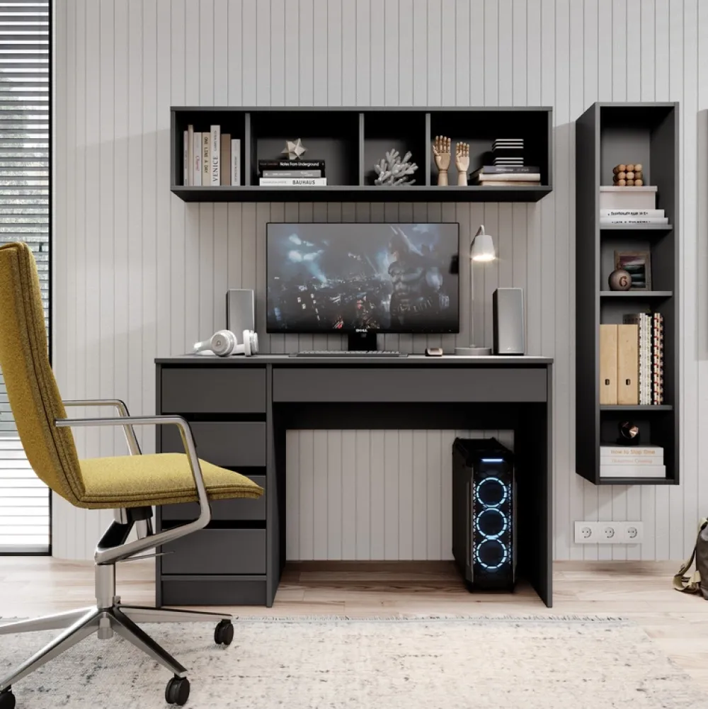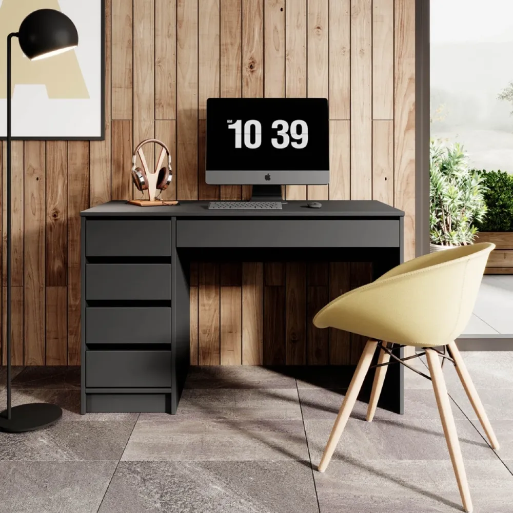 Biurko nowoczesne JULIA w eleganckim kolorze antracyt to idealne rozwiązanie do domowego biura, pokoju nastolatka czy przestrzeni do nauki. Jego uniwersalna konstrukcja z pięcioma pojemnymi szufladami zapewnia nie tylko wygodę użytkowania, ale też funkcjonalność, która sprosta codziennym wyzwaniom. Brak uchwytów i matowe wykończenie nadają meblowi minimalistycznego, a zarazem eleganckiego charakteru.
