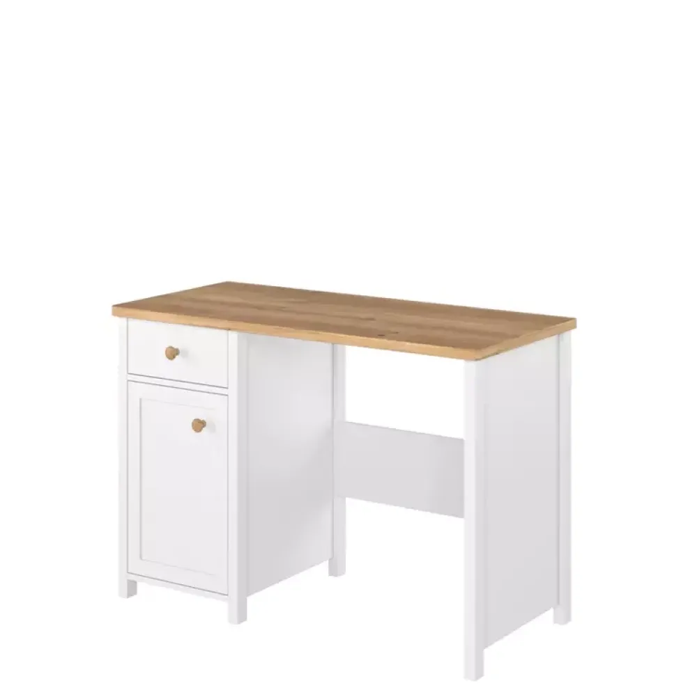 - Biurko młodzieżowe STORY zostało wykonane w kolorze bieli alpejskiej w połączeniu. Biurko posiada blat o szerokości 110 cm, który gwarantuje komfortową przestrzeń do nauki oraz spędzania czasu przy komputerze. Posiada szafkę z szufladą i półką za drzwiami