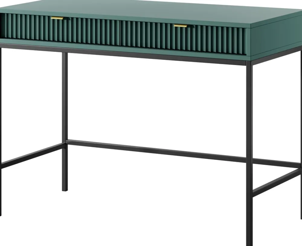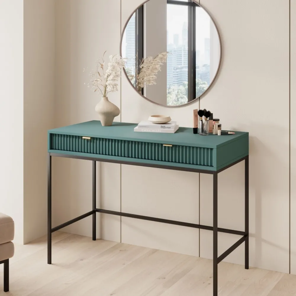 - Toaletka z szufladami AVANTI posiada ryflowany front wykonany z płyty MDF. Nogi toaletki wykonano z solidnego metalu, natomiast aluminiowe uchwyty w kolorze złotym nadają bryle charakteru. Toaletka posiada dwie głębokie szuflady.