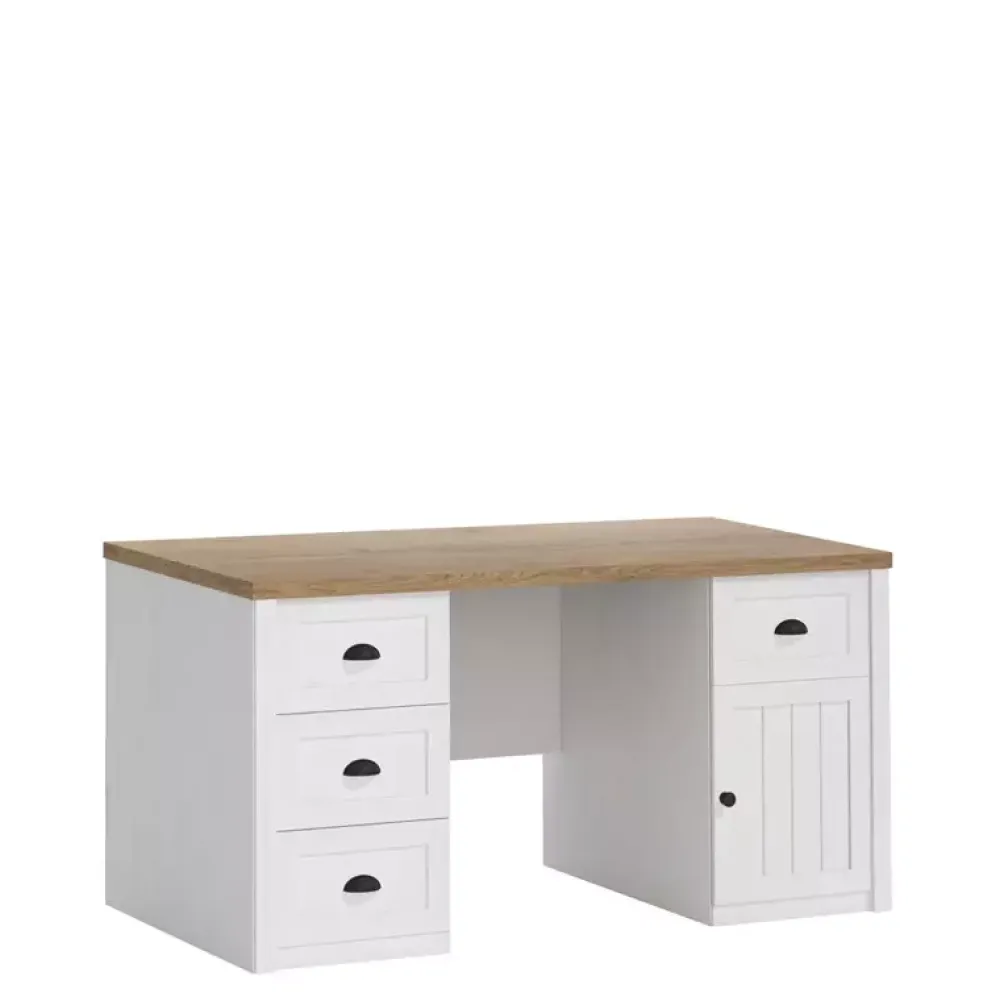 - Biurko PALAZO zostało wyposażone w blat o szerokości 160 cm który zapewni dużą powierzchnię do pracy oraz nauki. Dodatkowo biurko posiada trzy szuflady znajdujące się po lewej stronie oraz szufladę po prawej stronie, pod którą znajdziesz szafkę.