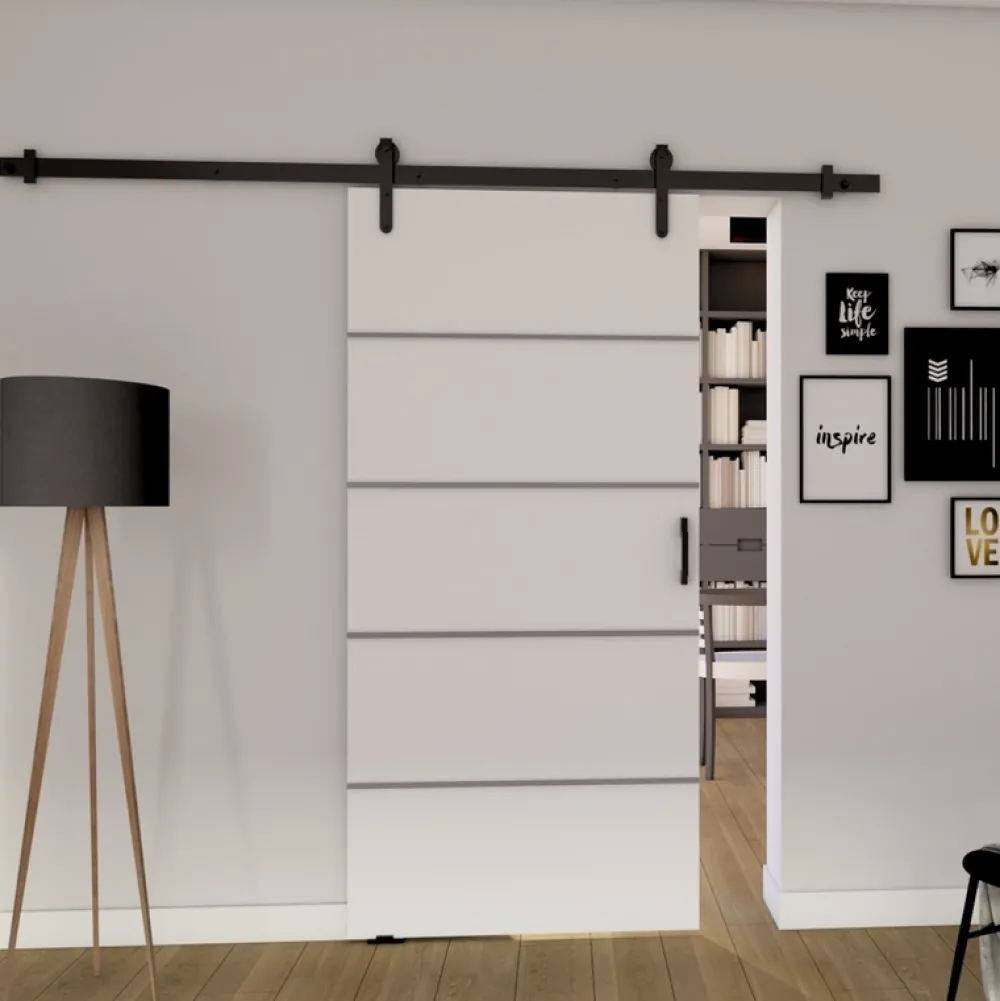 Metalowy system przesuwny, malowany proszkowo, jest synonimem wytrzymałości. Jego ciemna barwa tworzy interesujący kontrast z jasnymi dekoracyjnymi wstawkami, nadając drzwiom surowego, industrialnego charakteru.