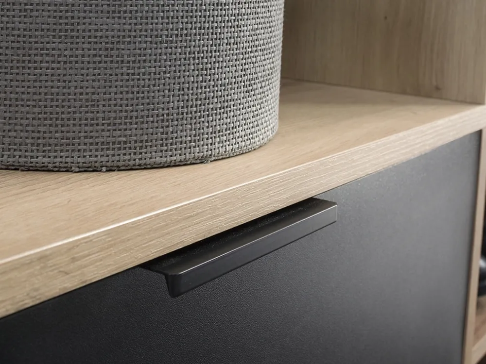 - Uchwyty mebla zostały wykonane z metalu w czarnym kolorze.