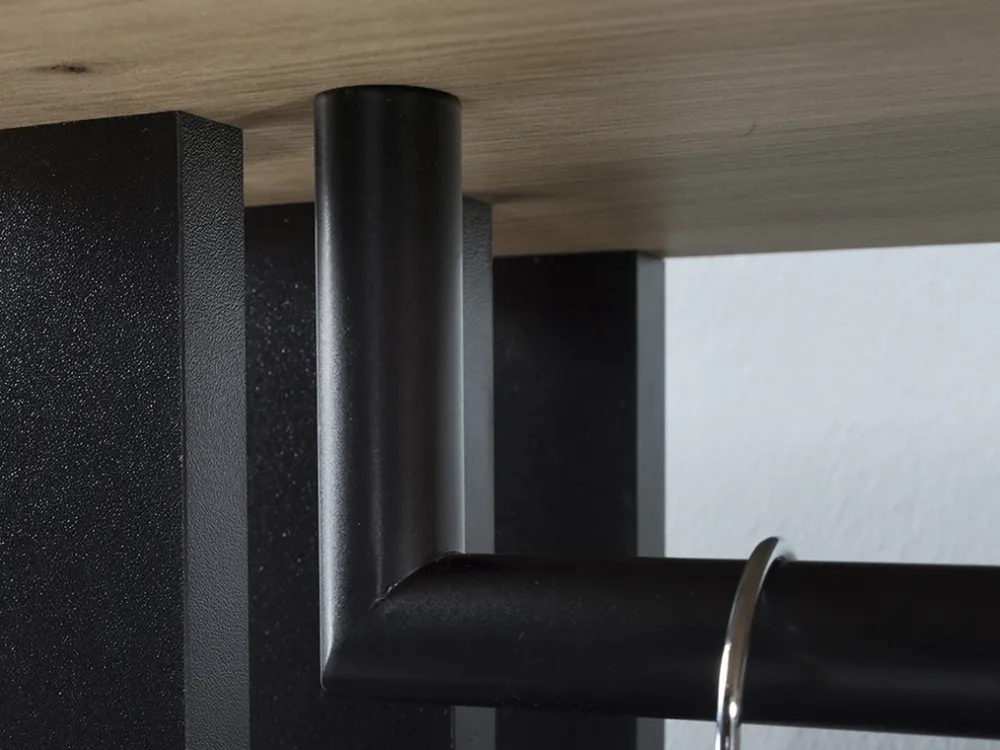 - Garderoba została wyposażona w metalowy drążek na wieszaki w czarnym kolorze. Pod przestrzenią na wieszaki znajduje się uchylna szafka.