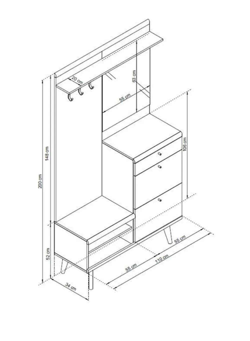 - Szafka na buty wyposażona w dwie uchylane półki i jedną szufladę na samej górze;