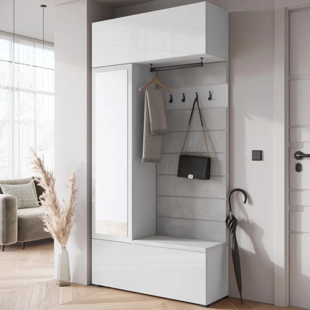 - Garderoba TESSARO łączy biały połysk z matowymi detalami, oferując siedzisko, lustro i bezuchwytowe otwieranie push-to-open. Tapicerowane panele i regulowane półki zapewniają komfort i funkcjonalność w nowoczesnym przedpokoju. Montaż uniwersalny.