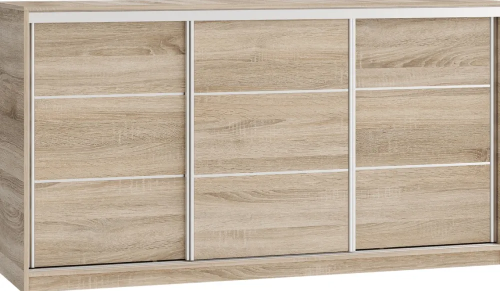 Komoda przesuwna TOP o szerokości 180 cm to propozycja, która łączy elegancki wygląd z praktycznymi rozwiązaniami. Trzy drzwi osadzone na metalowym systemie przesuwnym w srebrnym kolorze wprowadzają nowoczesny akcent i gwarantują łatwy dostęp do przechowywanych rzeczy