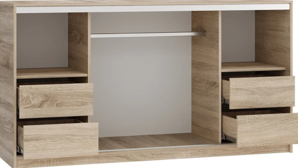 Po lewej i prawej stronie komody znajdują się po dwie przestronne szuflady, które są idealne do przechowywania mniejszych przedmiotów lub odzieży. Nad każdą szufladą umieszczono półkę, która oferuje dodatkowe miejsce na większe przedmioty, organizery lub dekoracje Środkowa część komody została wyposażona w aluminiowy drążek na wieszaki, co czyni ją idealnym rozwiązaniem do przechowywania ubrań wymagających powieszenia