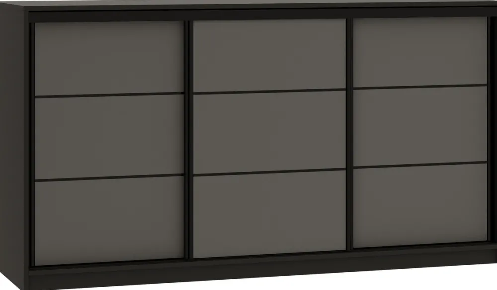 Komoda przesuwna LOFT o szerokości 180 cm to połączenie nowoczesnego designu i praktycznych rozwiązań Trzy drzwi osadzone na metalowym systemie przesuwnym w czarnym kolorze wprowadzają industrialny charakter do wnętrza, jednocześnie ułatwiając dostęp do przechowywanych rzeczy