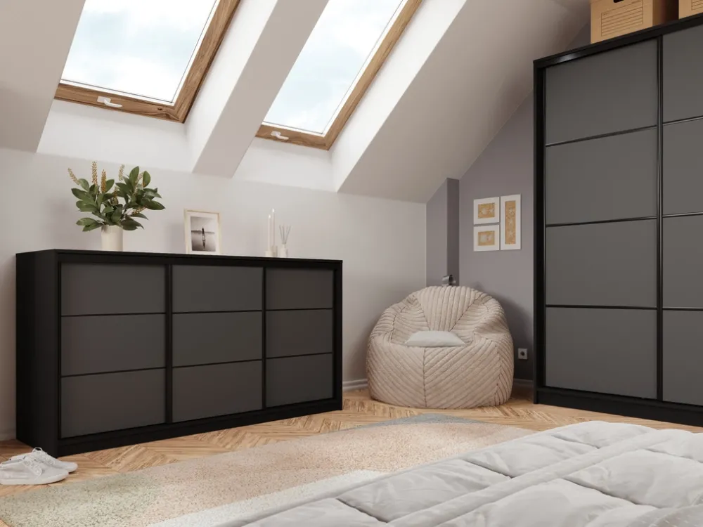 - Komoda przesuwna 180 cm LOFT charakteryzuje się pojemnym wnętrzem, które składa się z aluminiowego drążka na wieszaki oraz czterech pojemnych szuflad na bieliznę i dwóch półek. Drzwi komody poruszają się na stalowym systemie przesuwnym.